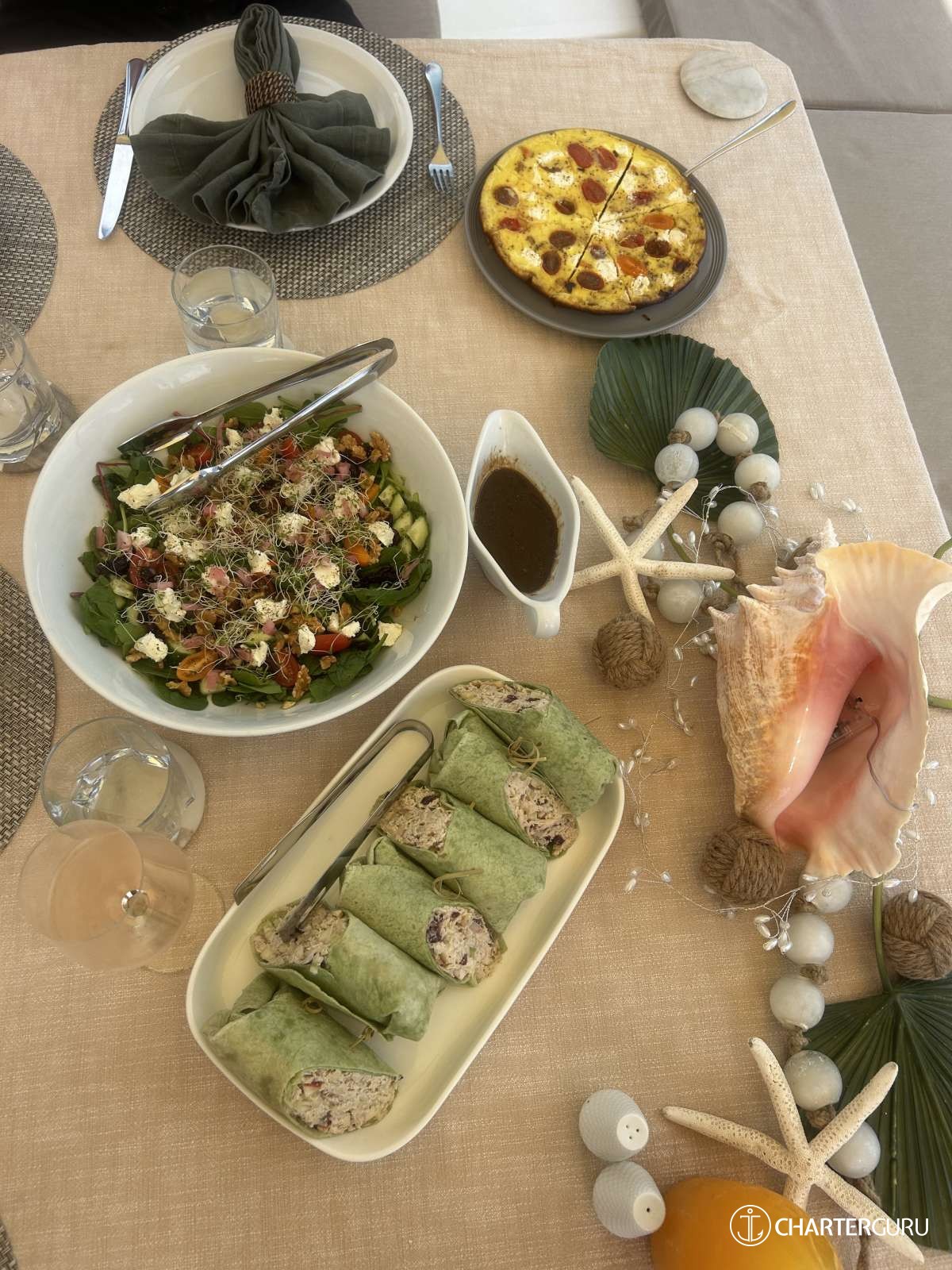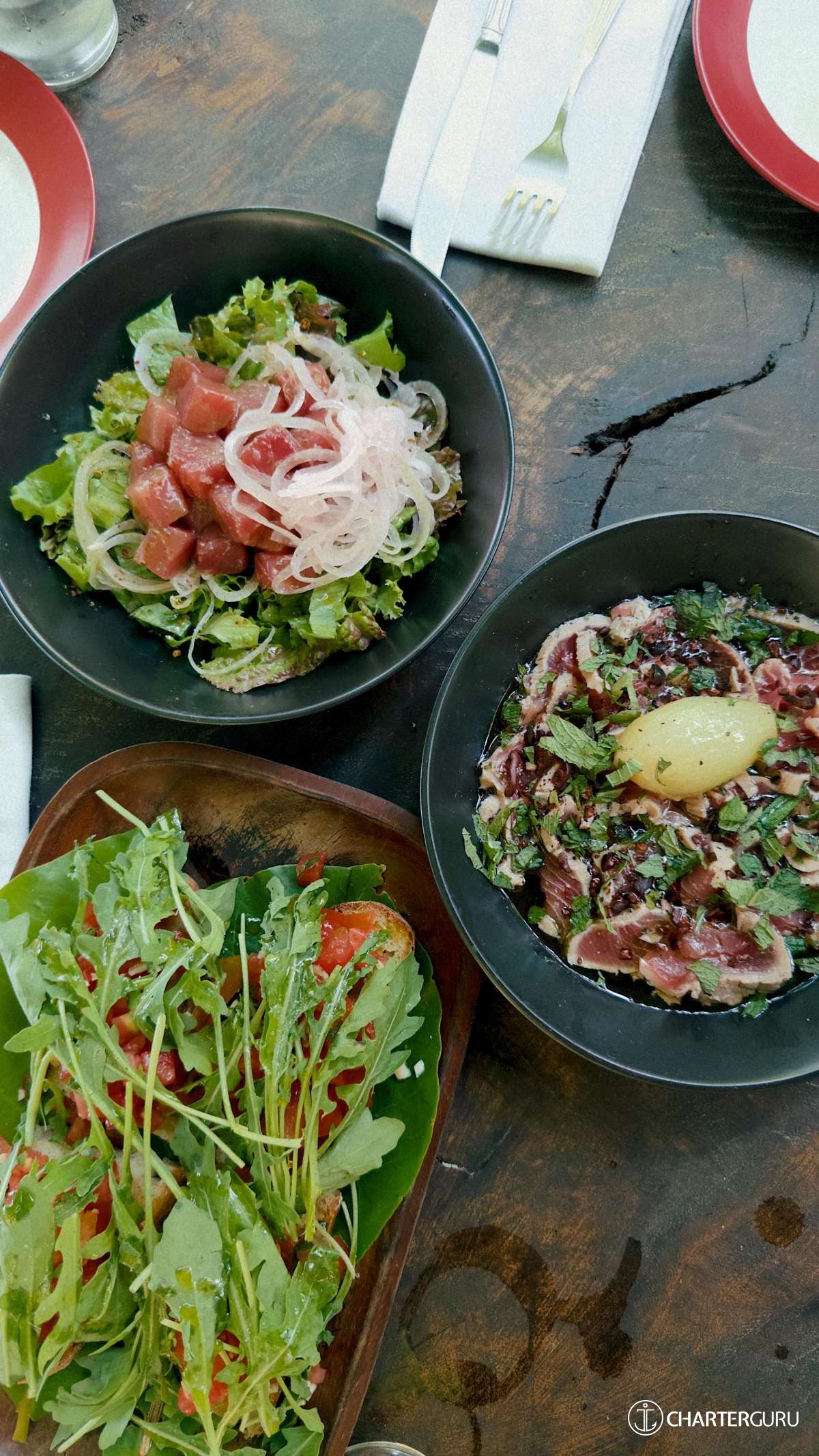 LOCAL FARE: Includes: 7 breakfasts, 5 lunches & 5 dinners. Requires 2 lunches and 2 dinners ashore at client expense. -For local fare, deduct $150 per person off the charter rate