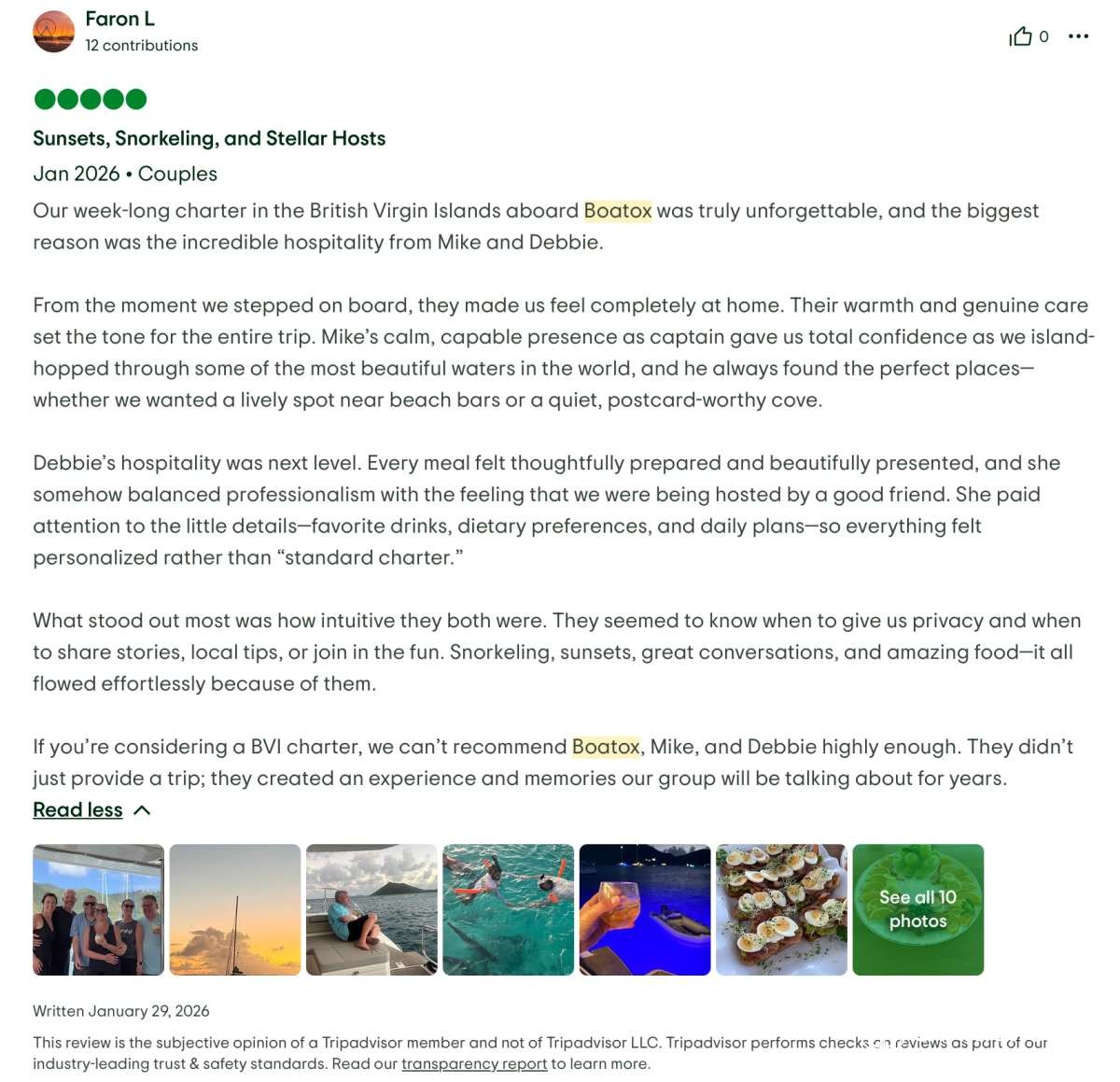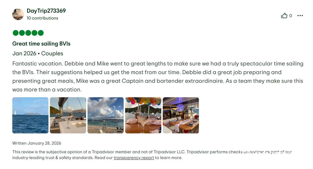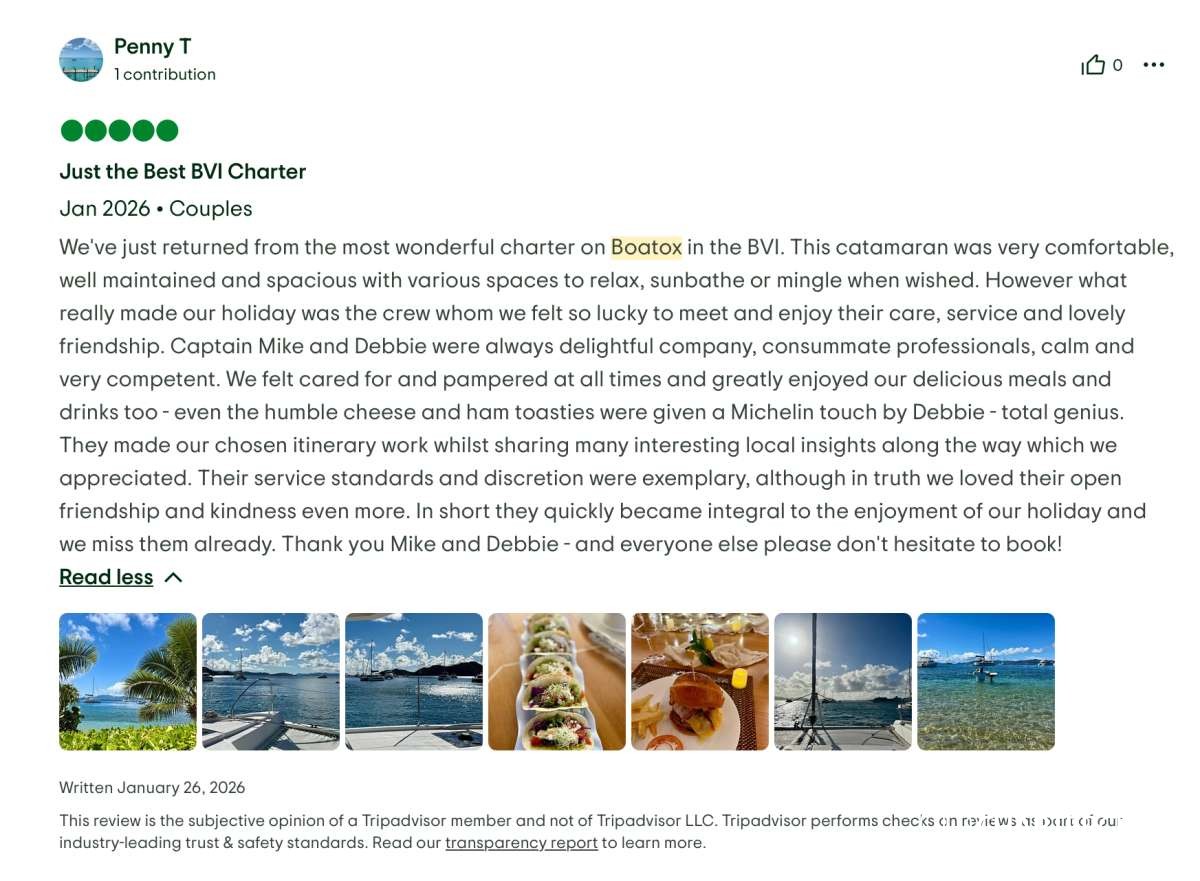 We would not hesitate for a moment to book another trip with them in the future — in fact, we’re already dreaming about it. If you’re considering a BVI catamaran charter, Boatox with Captain Mike and Chef Debbie is exceptional in every way. This is the kind of experience that stays with you long after you return home.