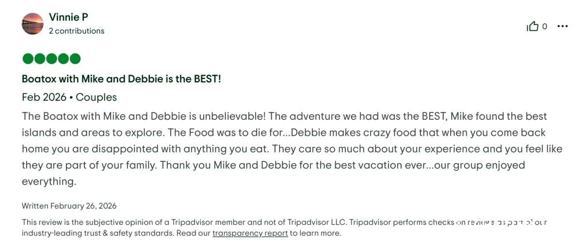 Our group was two couples — “four best friends from Boston” — and from the very first day, Captain Mike and Chef Debbie made us feel completely at home. This husband-and-wife team goes far beyond “excellent service”; they create an experience that feels personal, effortless, and incredibly special. By the end of the week, they genuinely felt like family.