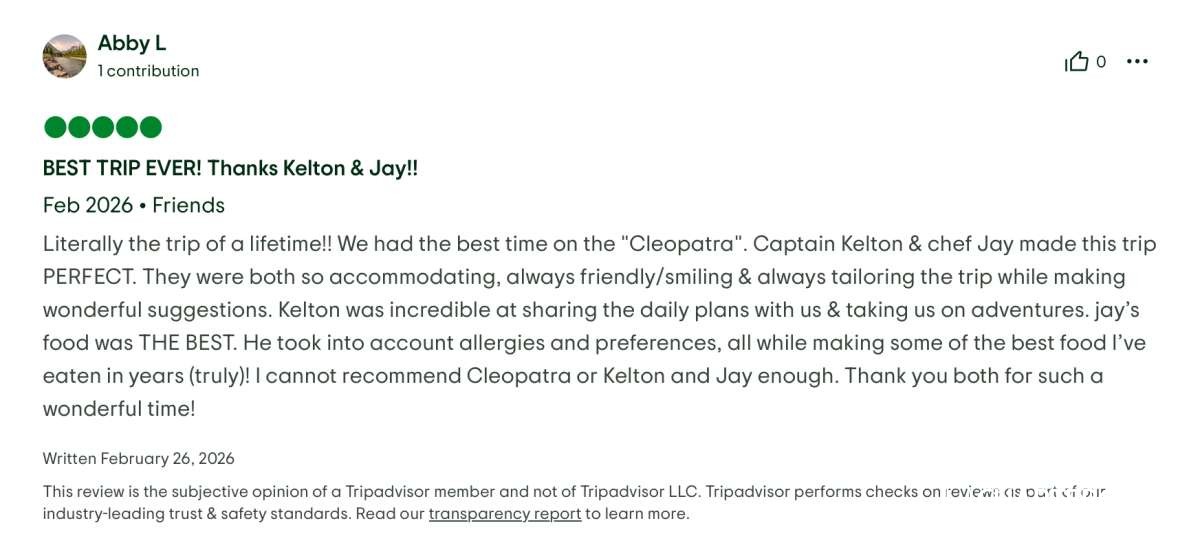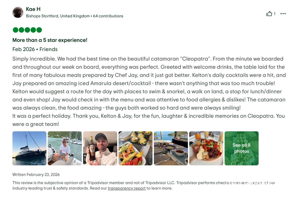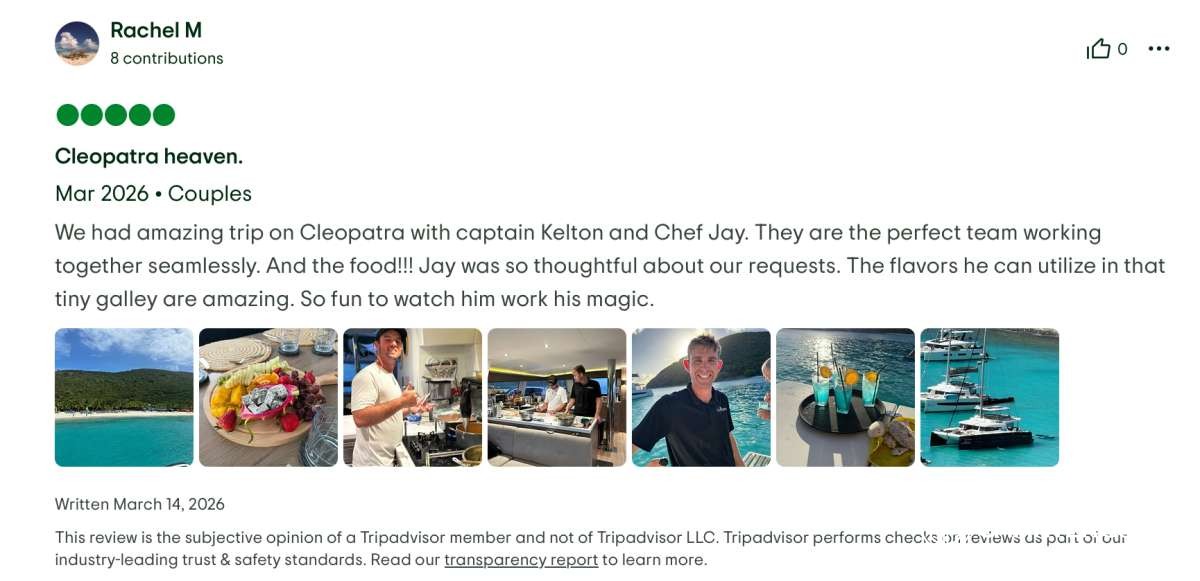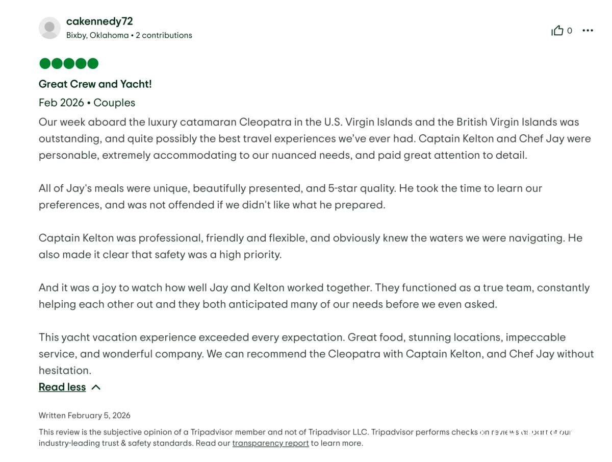 This yacht vacation experience exceeded every expectation. Great food, stunning locations, impeccable service, and wonderful company. We can recommend the Cleopatra with Captain Kelton, and Chef Jay without hesitation.