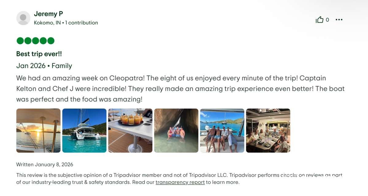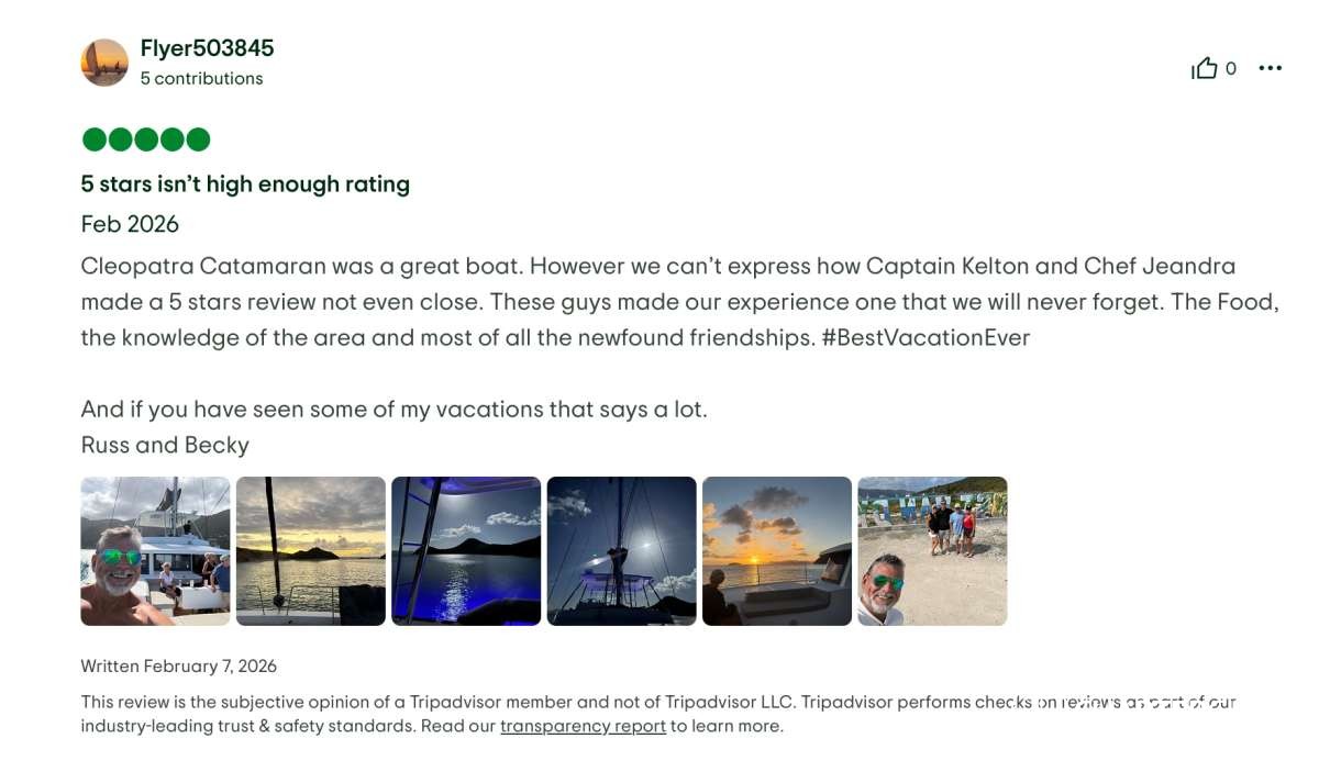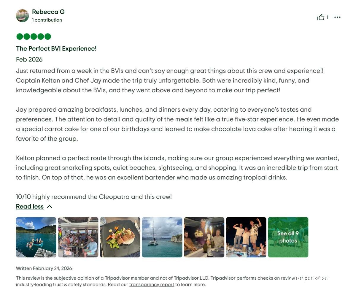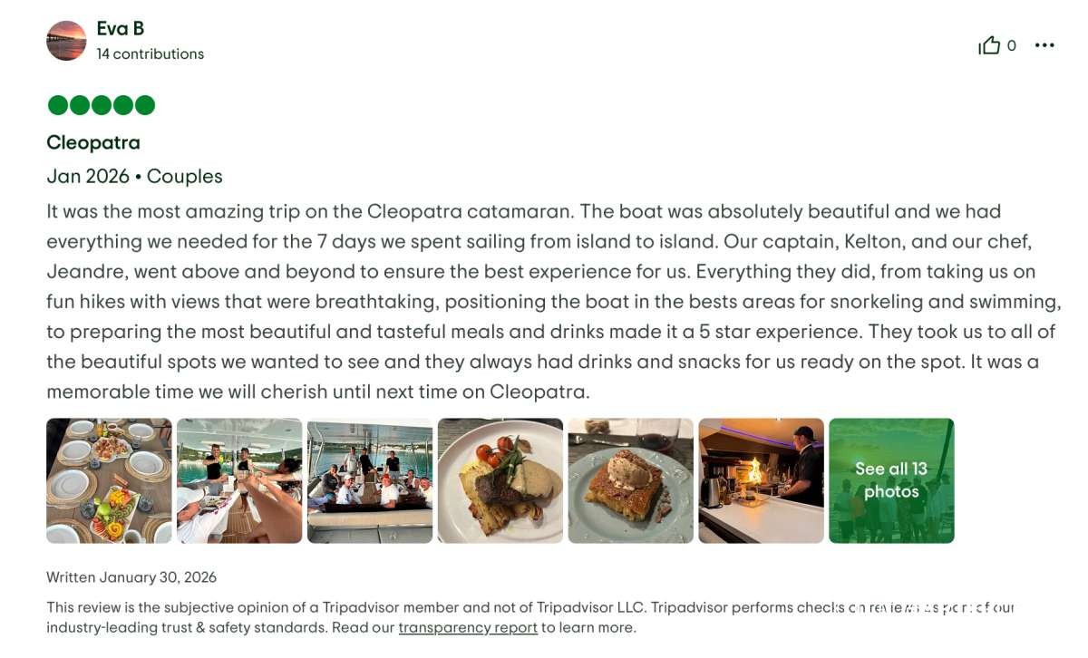 This yacht vacation experience exceeded every expectation. Great food, stunning locations, impeccable service, and wonderful company. We can recommend the Cleopatra with Captain Kelton, and Chef Jay without hesitation.