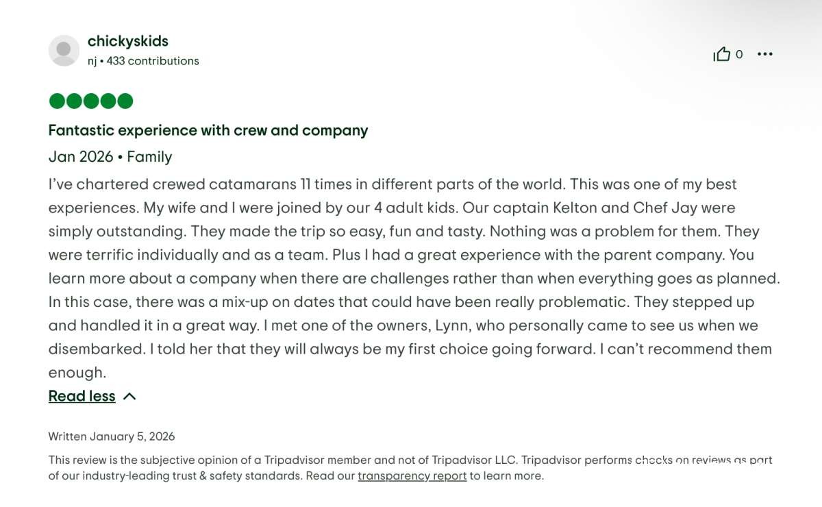 Kelton would suggest a route for the day with places to swim & snorkel, a walk on land, a stop for lunch/dinner and even shop! Jay would check in with the menu and was attentive to food allergies & dislikes! The catamaran was always clean, the food amazing - the guys both worked so hard and were always smiling!