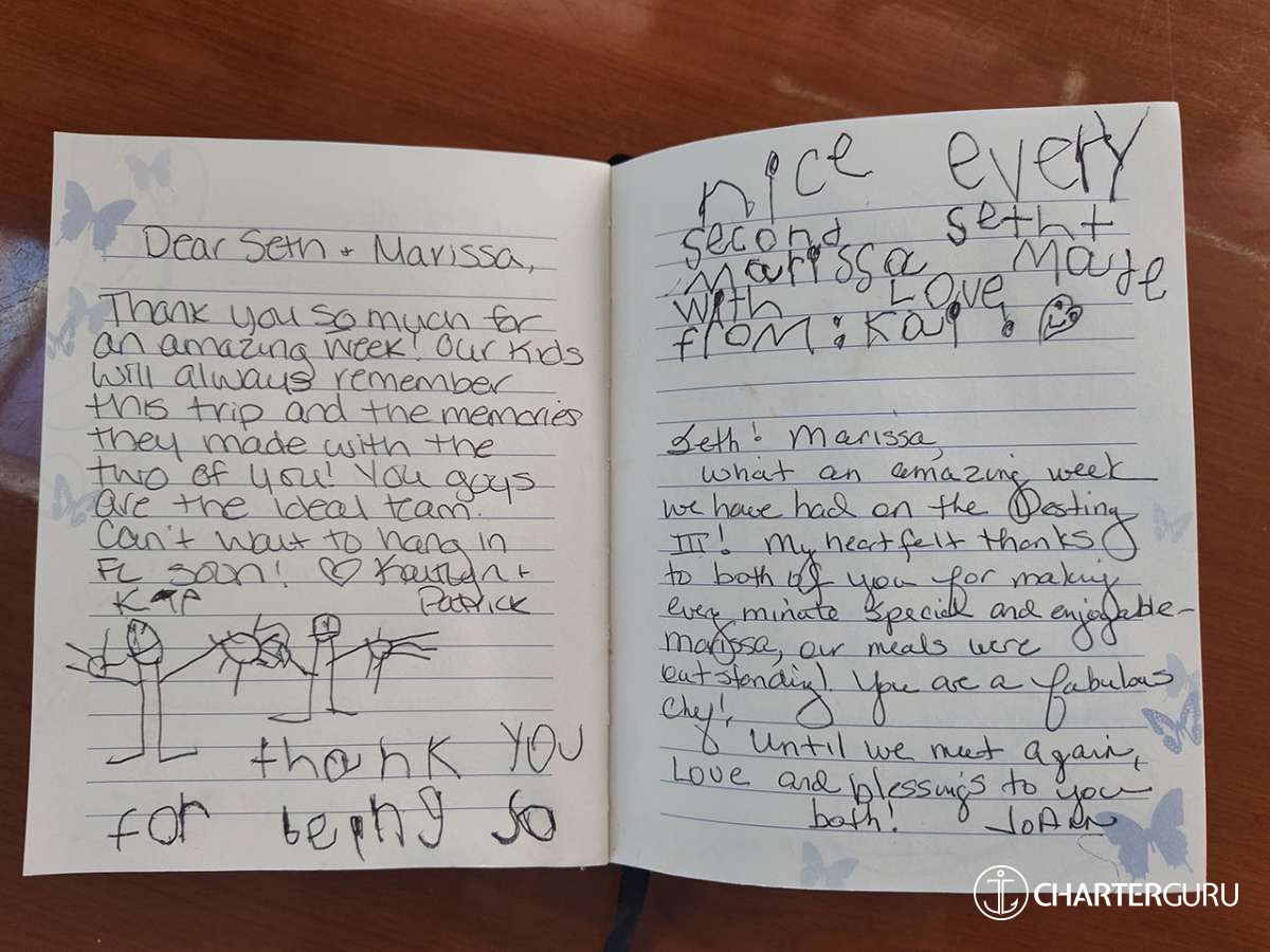 Thanks so much for your kind words. Last night at dinner we reviewed all the fantastic moments spent on destiny. Kids were so appreciative and said they really had a blast with you. Your humour and positive attitude, the fantastic food, the sense of adventure and the opportunity to relax were just a few of the points raised. Pipi boy and Thomiiii did not stop talking about all these wonderful moments with you two. Siobhan is a great addition to your team. She is so kind and devoted. You two make a great team. We are now trying not to compare our little hotel to the luxury of your catamaran so the wonders of the Bahamas keep on living. Soon we shall be back in the less exciting world of Nassau and Switzerland… but memories remain for ever and in German there is a saying that goes like this: in life you always meet good people twice.