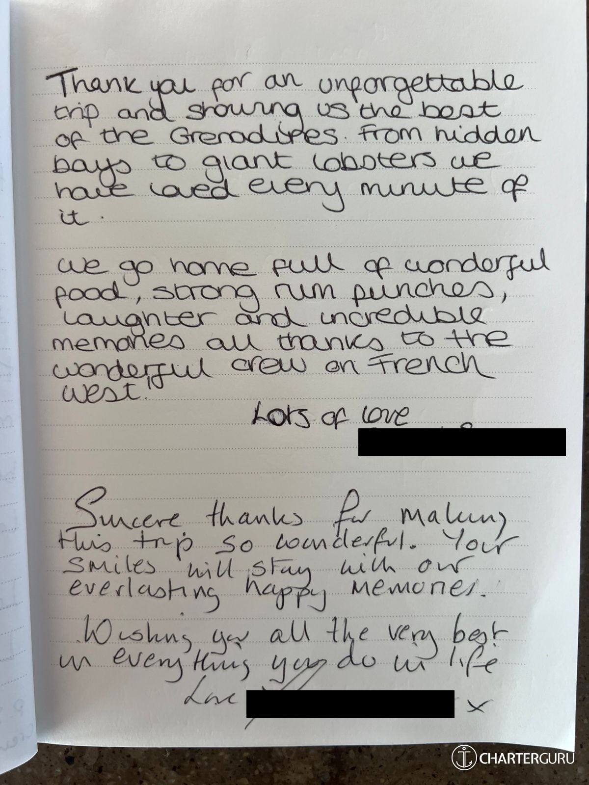 Thank you for an unforgettable week in St Barts. French West is truly a dream boat. The service, food, accommodations were top -notch and of course the company as well. Hope that our paths cross again someday!