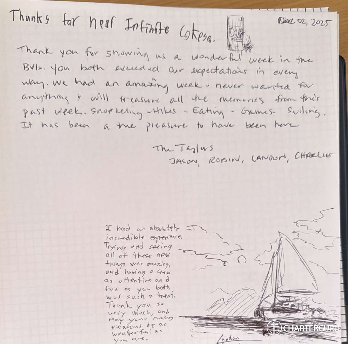 Thank you both for making our vacation amazing! You made every effort to make us feel at home and it is greatly appreciated. Amy, thank you for the great food you prepared all week. Biff thank you for the fantastic snorkelling and for “letting me drive your dinghy” !!!