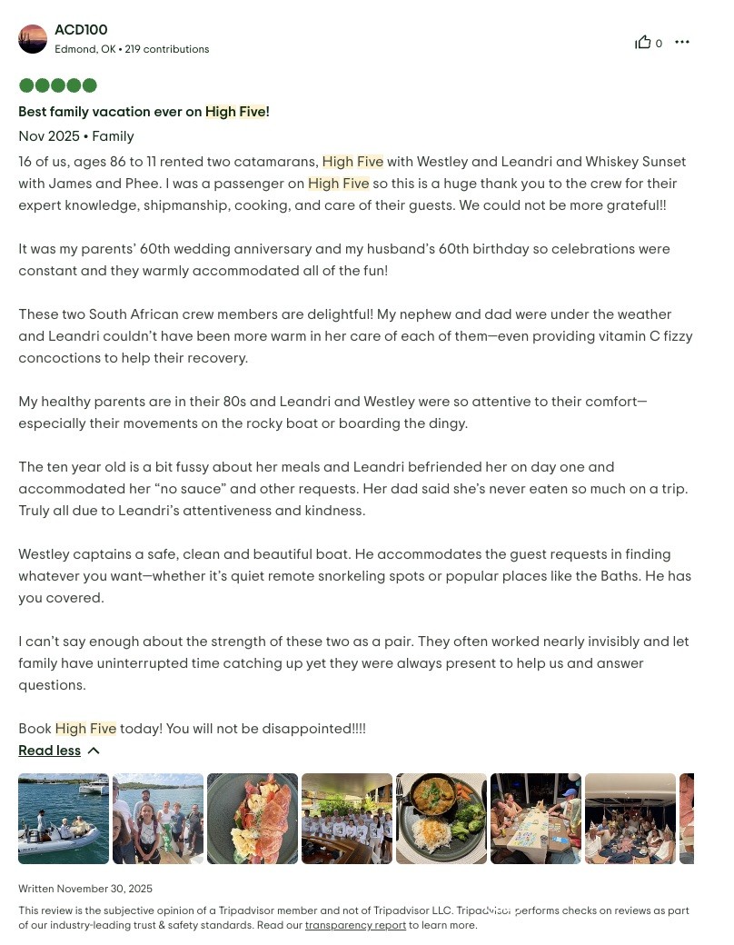 Thank you for such a wonderful trip on High 5. Everything has been first class - the food, the fun, and all the great company. Hot Tamale is the best captain/crew duo in the BVI! We will not forgot you guys.