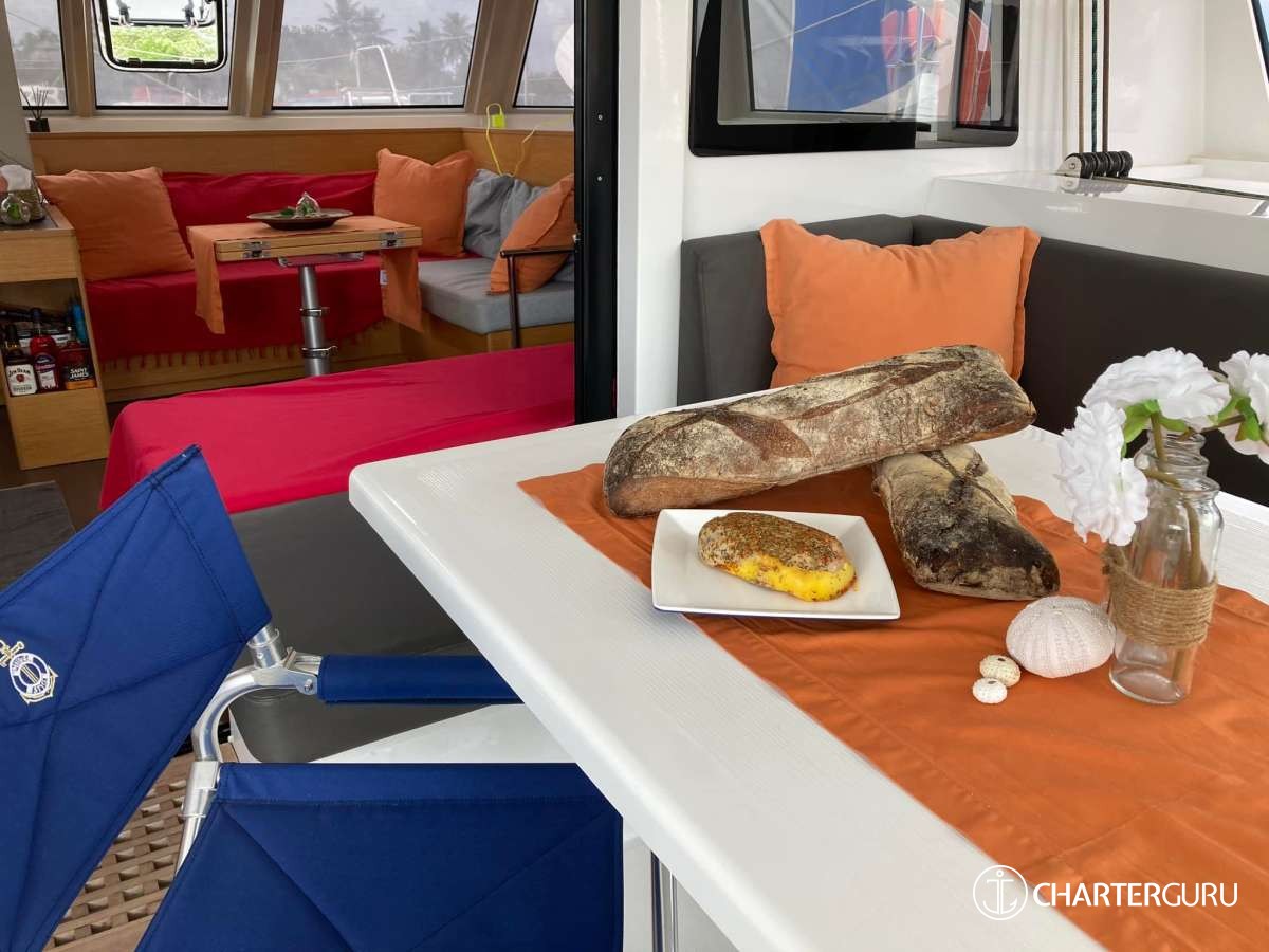 Wide patio doors open onto the alfresco dining and lounging areas beneath the protection of the rigid bimini. Comfortable seating around the large table is ideal for anyone who loves alfresco living protected from the sun. Those who want to bask in the sun, cooled by the tropical wind, can sprawl across the sunbathing area between the hulls.