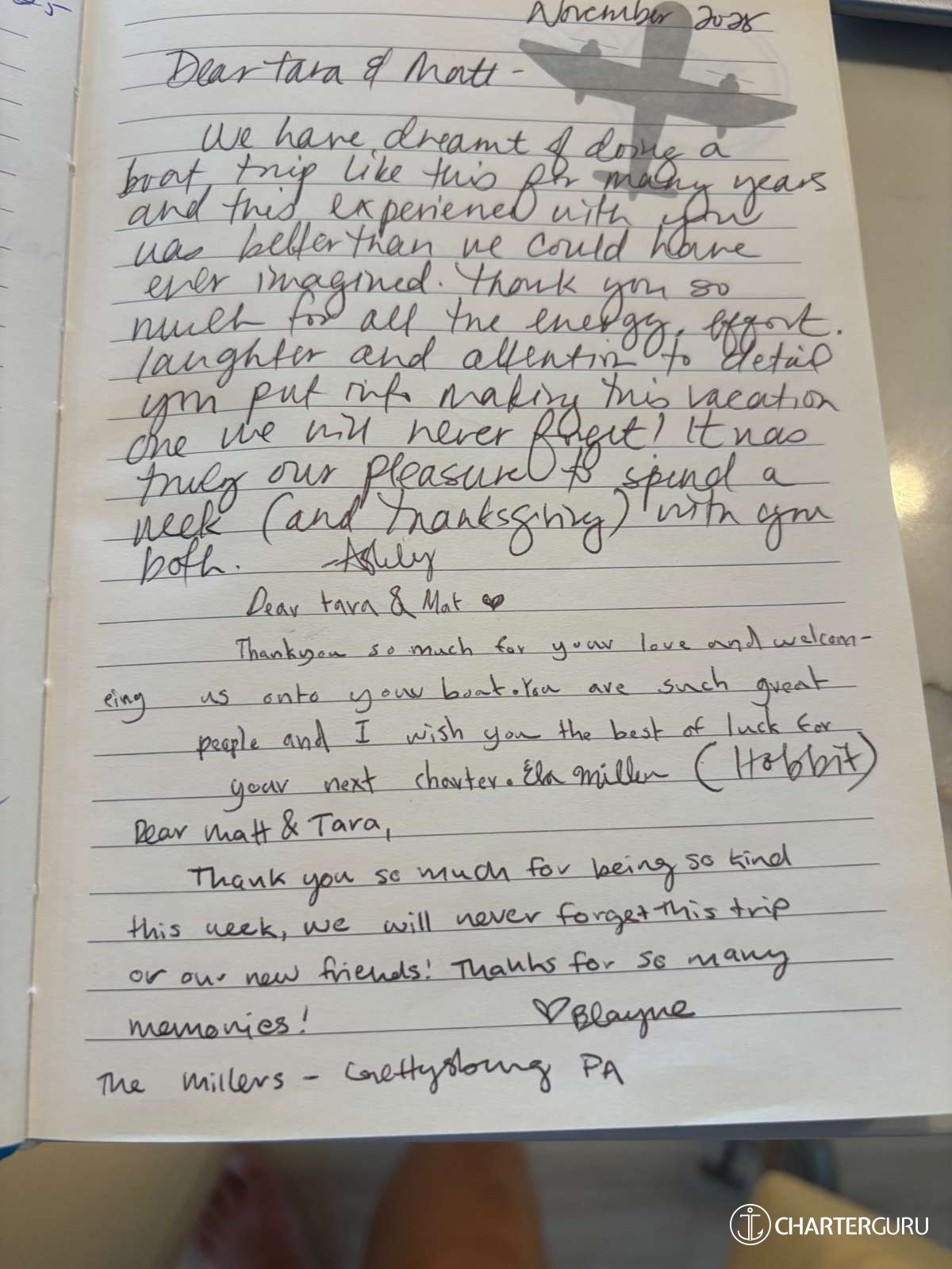 We have dreamt of doing a boat trip like this for many years and this experience with you was better than we could have ever imagined. Thank you so much for all the energy, effort, laughter and attention to detail you put into making this vacation one we will never forget! It was truly our pleasure to spend a week (and Thanksgiving) with you both.