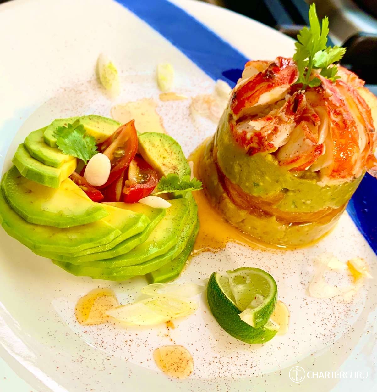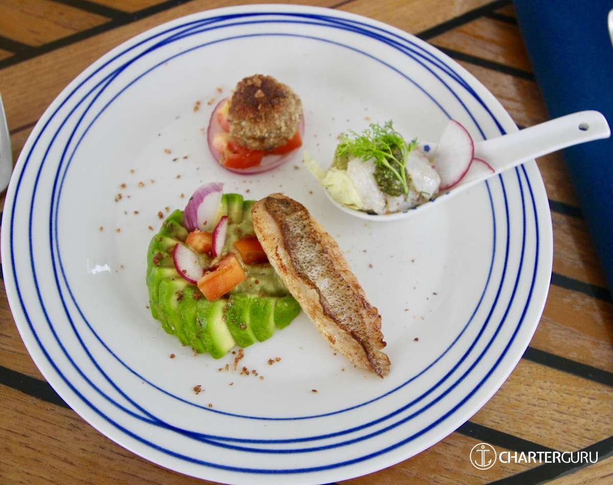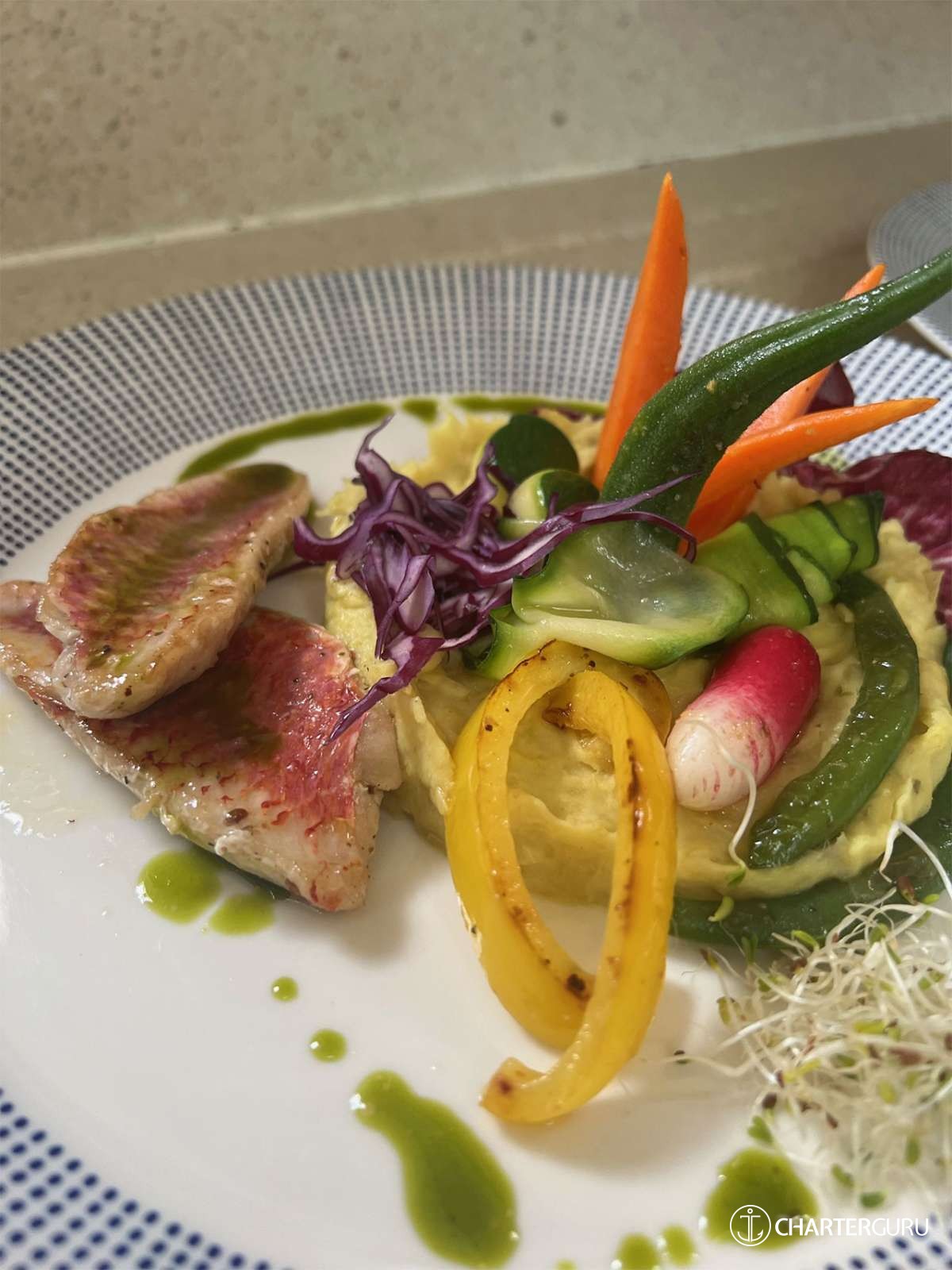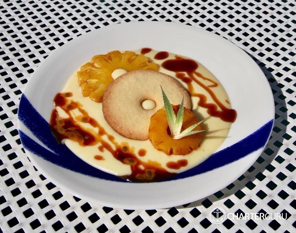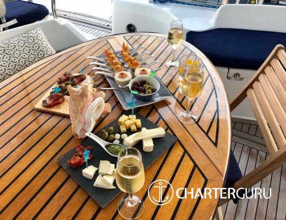 The large cockpit is the preferred spot for dining al fresco with magnificent views. Easy access to wide transoms makes launching water toys and diving into the Caribbean Sea effortless fun, even for children. Snorkeling or diving right off the yacht is spectacular. Captain Laurent is a licensed PADI instructor and Chef Astrid is a licensed PADI Divemaster. They offer one "discover scuba diving" or a dive per person for a minimum stay of seven nights. Award-winning Chef Astrid took first place at the 2018 Grenada Charter Yacht Show Culinary Competition.