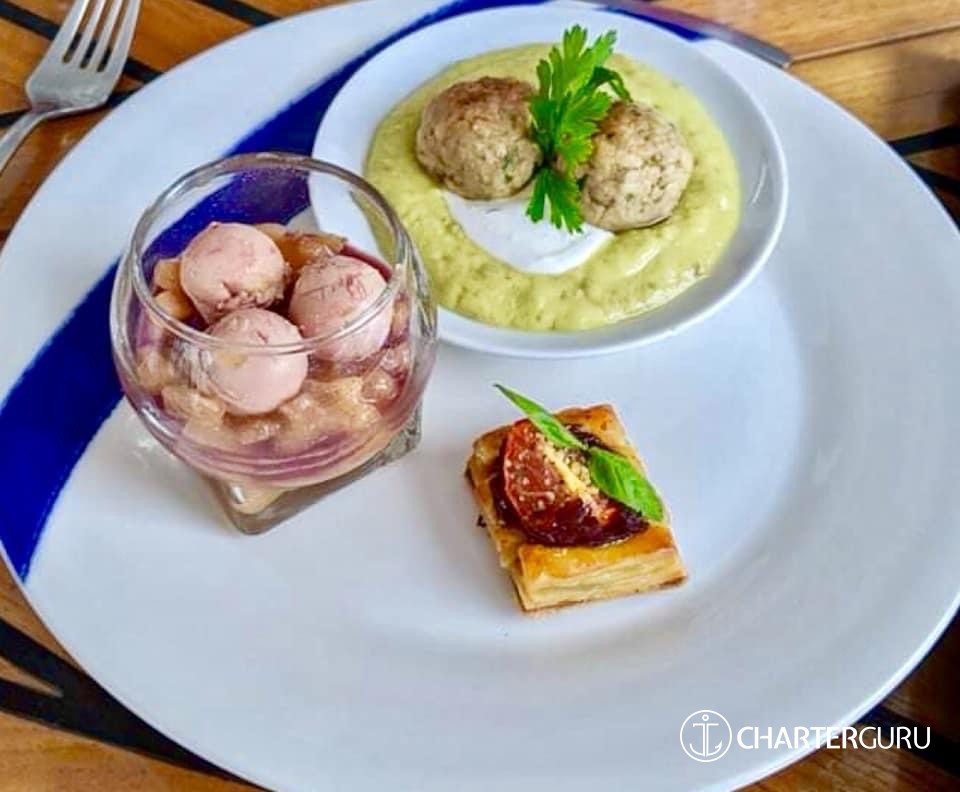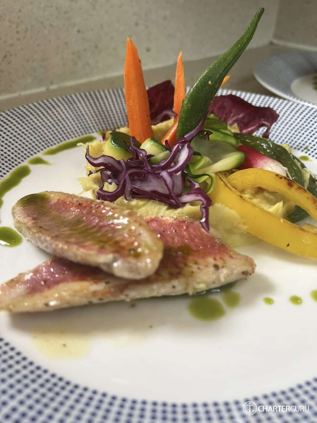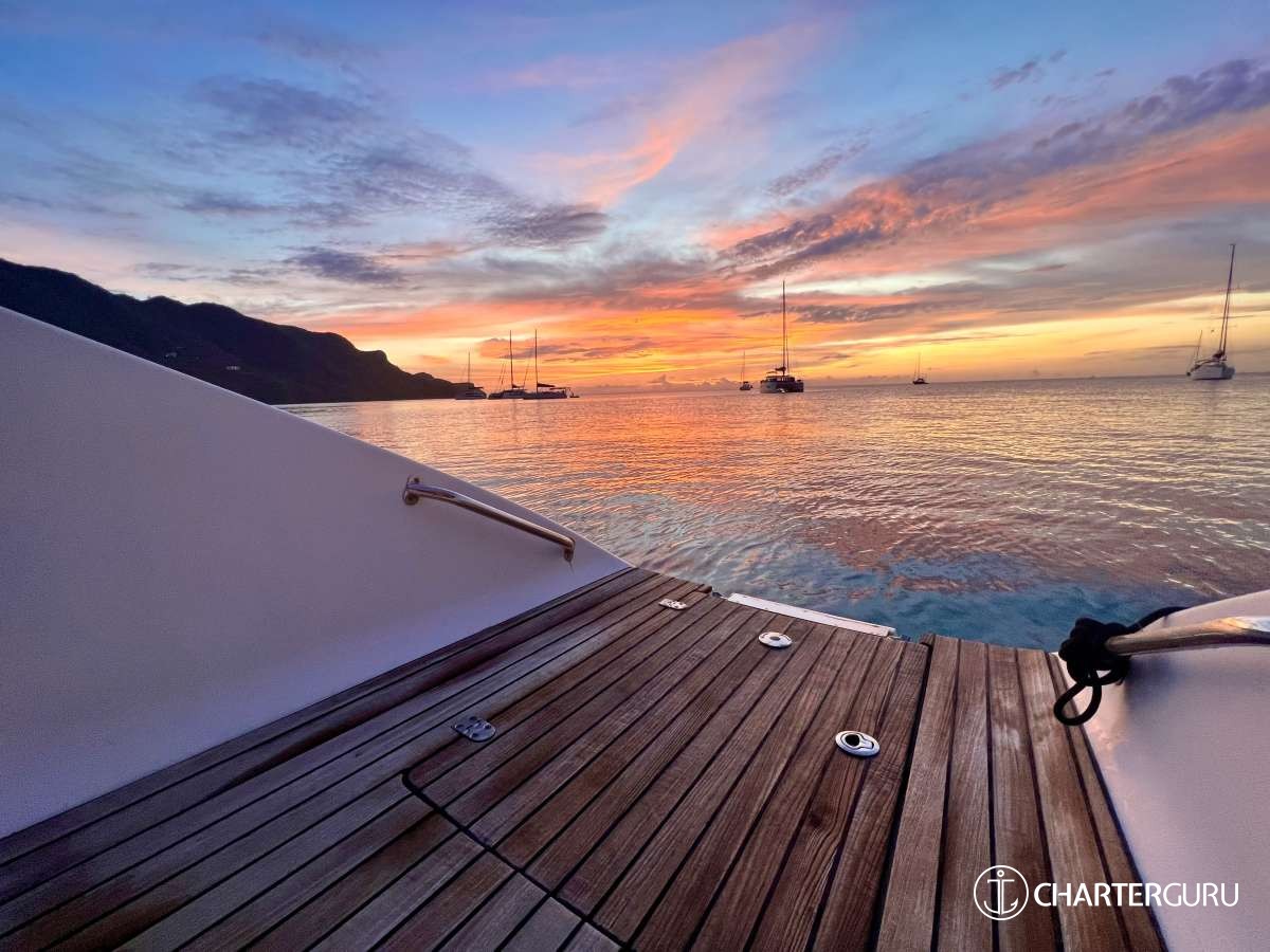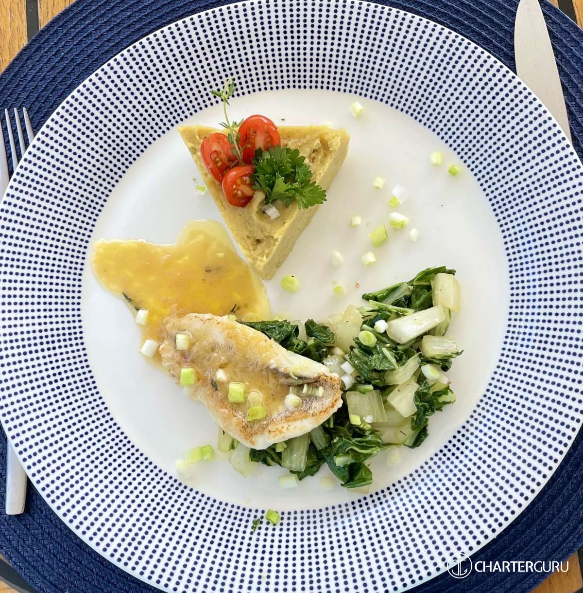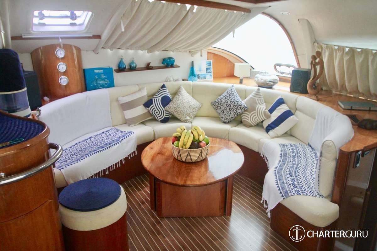 The large cockpit is the preferred spot for dining al fresco with magnificent views. Easy access to wide transoms makes launching water toys and diving into the Caribbean Sea effortless fun, even for children. Snorkeling or diving right off the yacht is spectacular. Captain Laurent is a licensed PADI instructor and Chef Astrid is a licensed PADI Divemaster. They offer one "discover scuba diving" or a dive per person for a minimum stay of seven nights. Award-winning Chef Astrid took first place at the 2018 Grenada Charter Yacht Show Culinary Competition.