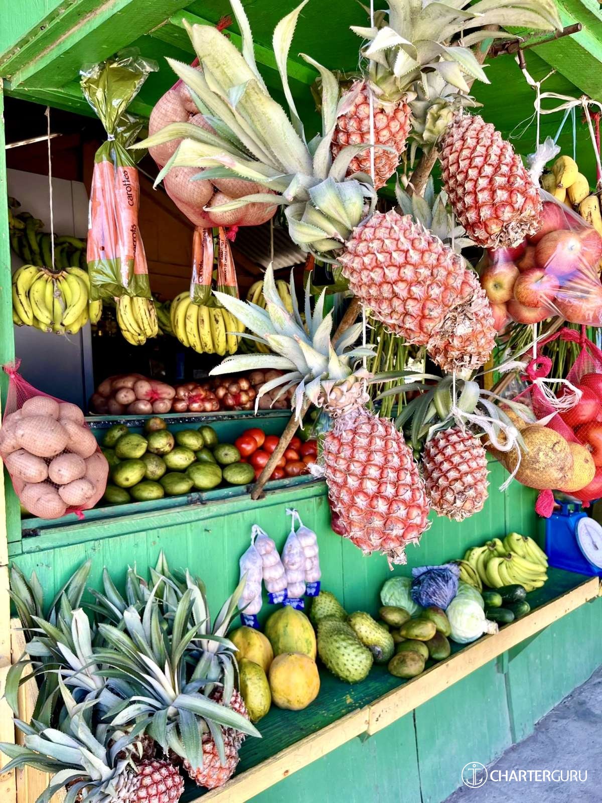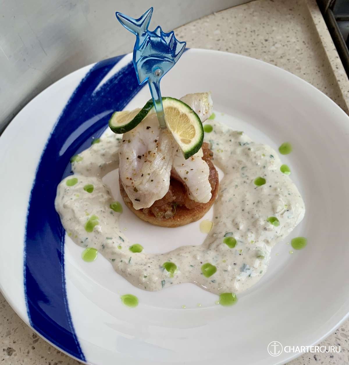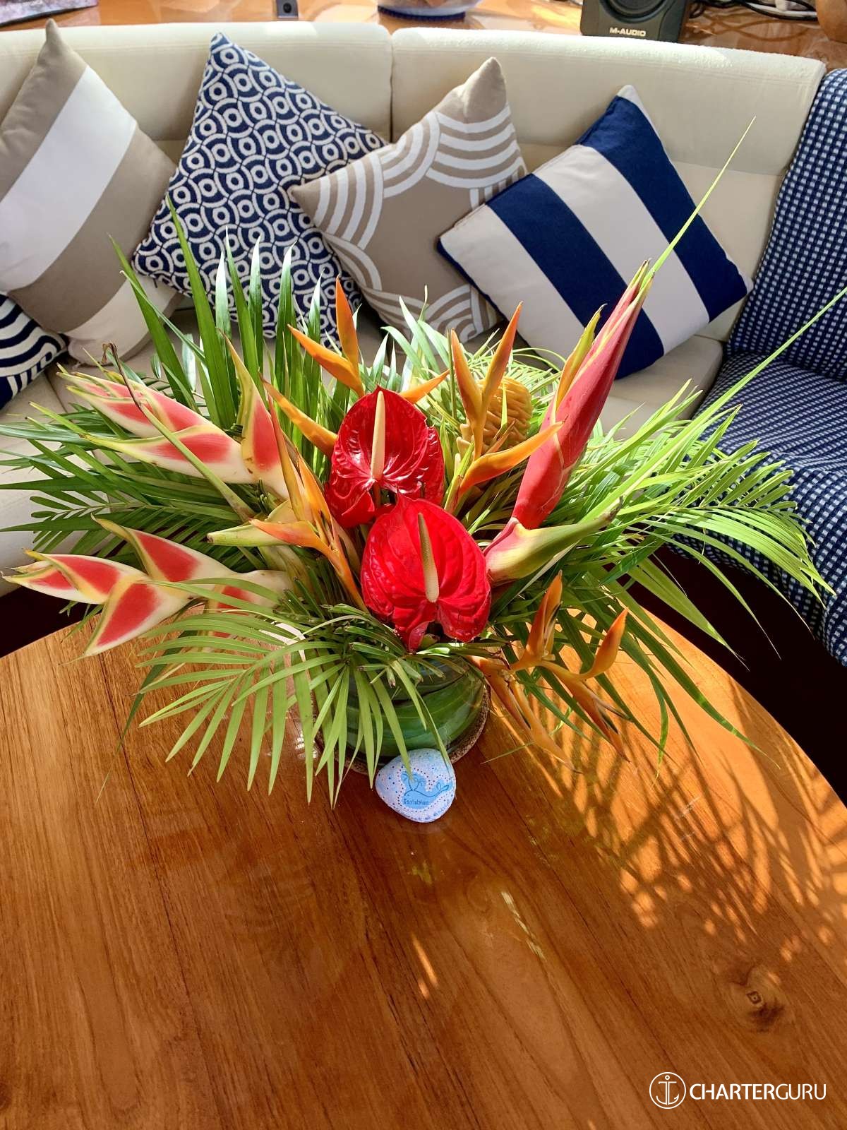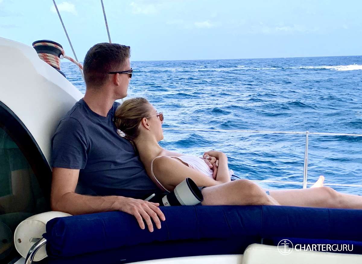 The large cockpit is the preferred spot for dining al fresco with magnificent views. Easy access to wide transoms makes launching water toys and diving into the Caribbean Sea effortless fun, even for children. Snorkeling or diving right off the yacht is spectacular. Captain Laurent is a licensed PADI instructor and Chef Astrid is a licensed PADI Divemaster. They offer one "discover scuba diving" or a dive per person for a minimum stay of seven nights. Award-winning Chef Astrid took first place at the 2018 Grenada Charter Yacht Show Culinary Competition.