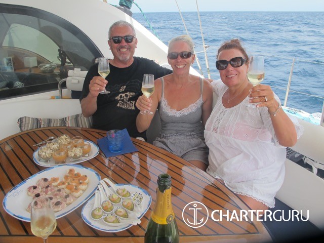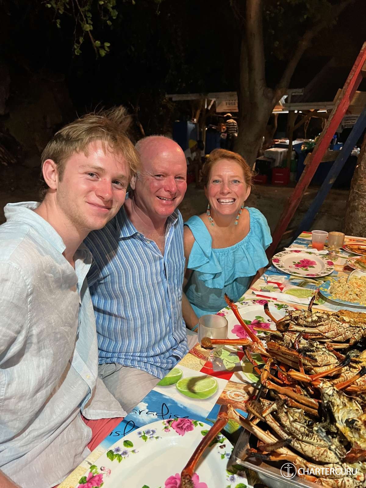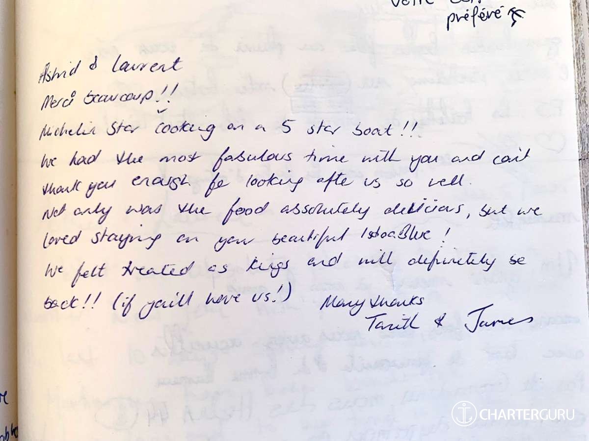 ´On behalf of my family, I want to extend our deepest thanks to you for facilitating our pairing with the Geslins on Isolablue for our charter! We all feel like we won the lottery! Of course, Isolablue is a beautiful vessel, but Laurent & Astrid are two of the loveliest people we have ever met.Their kindness, graciousness, and charm made this past week one of the most wonderful and memorable of our lives. We will always treasure our time with them.They were accommodating beyond any expectations, and ´spoiled´ us as we have never been ´spoiled´! We feel that we have made life-long friends.