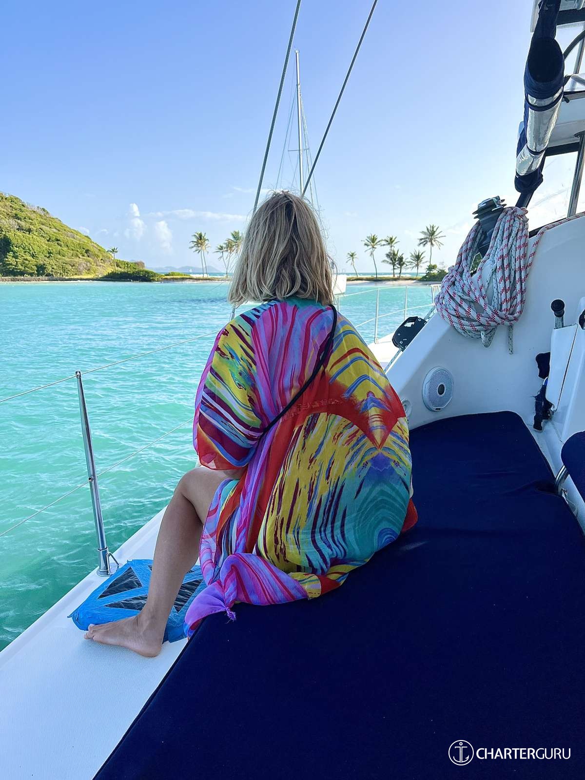 The boat itself is a very comfortable layout -she did say the sharing of one starboard toilet -a ( a personal choice they made to create the bigger master shower on the starboard side) works better with family vs two couples. There is clearly one stateroom that is roomier overall ( one Todd and I were in) though all three were able to sleep two. -it was very comfortable and though it had nice air conditioning, if we had wanted it, the sea breeze at night was our preference as the hatches were perfectly placed to enjoy the air. The deck in front was very comfortable and even had a couple chairs -we preferred the trampolines which they had replaced with a very nice feeling product-one that does not leave you with big criss cross marks ! :). Bryn’s preference was the bow!