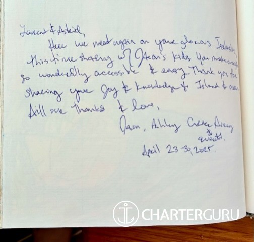 Le voyage était formidable! Merci beaucoup. Thank you so much Laurent for the incredible sailing, diving, music and dancing. The hospitality, food and wine were wonderful and we can’t wait to come back and sail with you again.