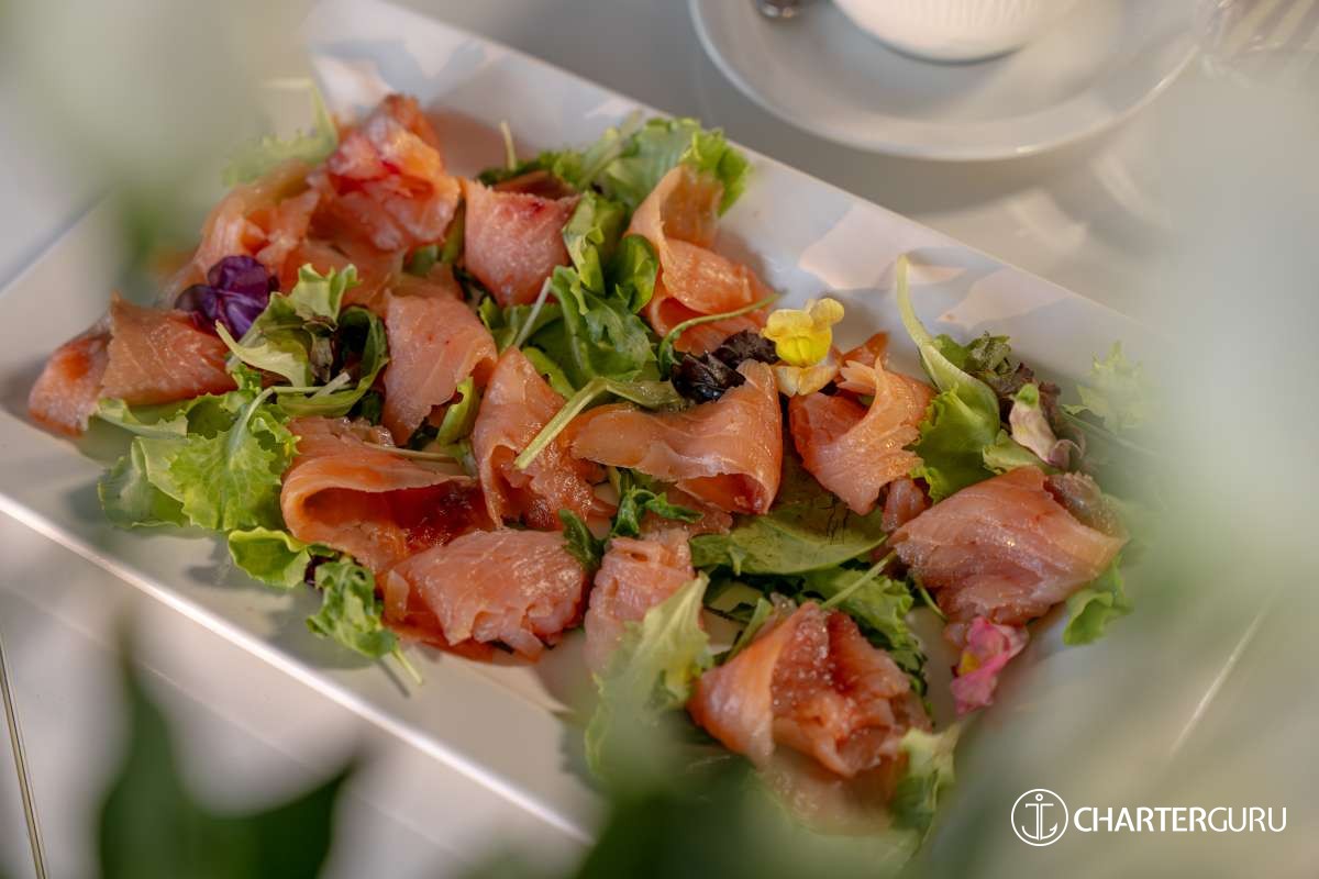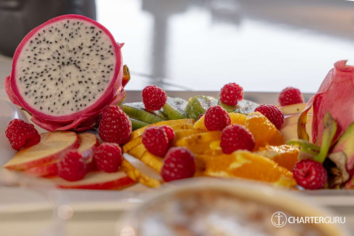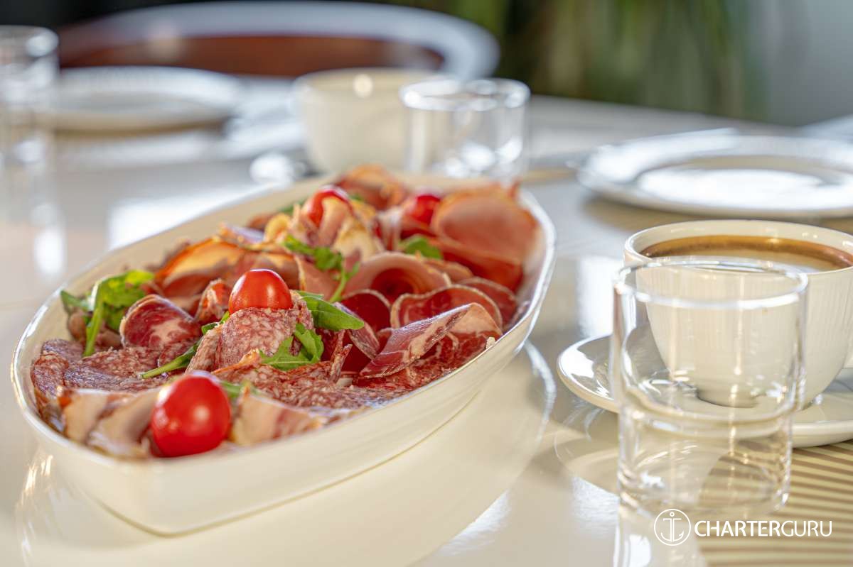 Yacht Karizma features 4 large decks where everybody can lounge comfortably. With endless sunchairs and a jacuzzi, the sundeck is definitely the favorite space for entertaining and relaxing. In case you want to shield yourself from the warm summer sun, the shaded area with cushioned chairs and coffee tables is the perfect spot to enjoy a refreshing drink.