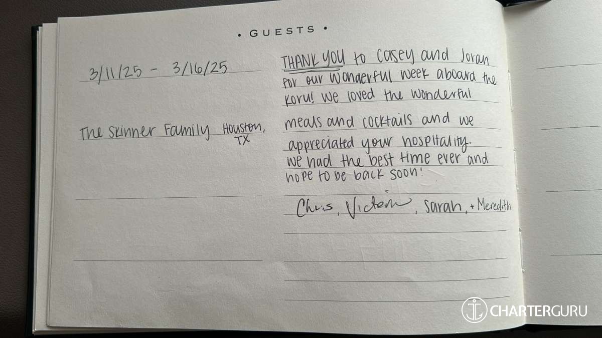 Thank you to Casey and Joran for our wonderful week aboard the Koru! We loved the wonderful meals and cocktails and we appreciated your hospitality. We had the best time ever and hope to be back soon! - The Skinner Family