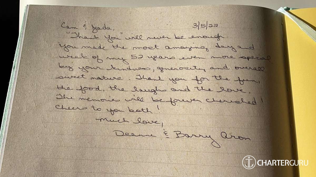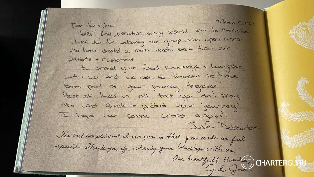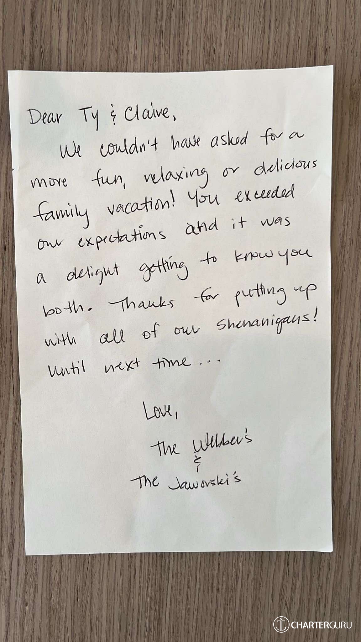 We had a wonderful time! The Boat was beautiful and spacious. Cam and Jada were excellent! They are such nice people. Cam is a great captain. He managed to schedule our trip around bad weather sneaking up on us. Jada is a marvelous cook. Every meal was expertly and deliciously prepared and served. Both of them are super nice. We had a great time playing cards at night with them and the kids. We hope they can visit us in Guatemala sometime.