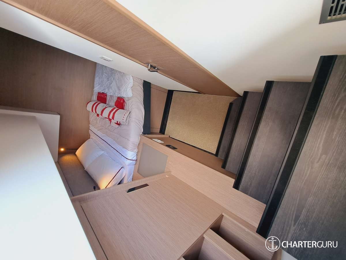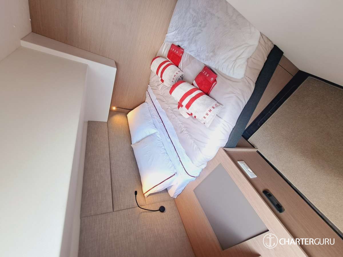 LE GRAND BOGAVANT is presented primarily as a sailing catamaran. The the core layout is spread out from the main saloon, which connects to the aft deck. The aft deck features a variety of seating areas and usually it is where you, as a charter guest, spend most of your time. The tastefully decorated cabins are located in the 2 massive hulls. The cabins offer designer mattrace beds and feature ensuite bathrooms. Multiple portholes connect you with the outside world.