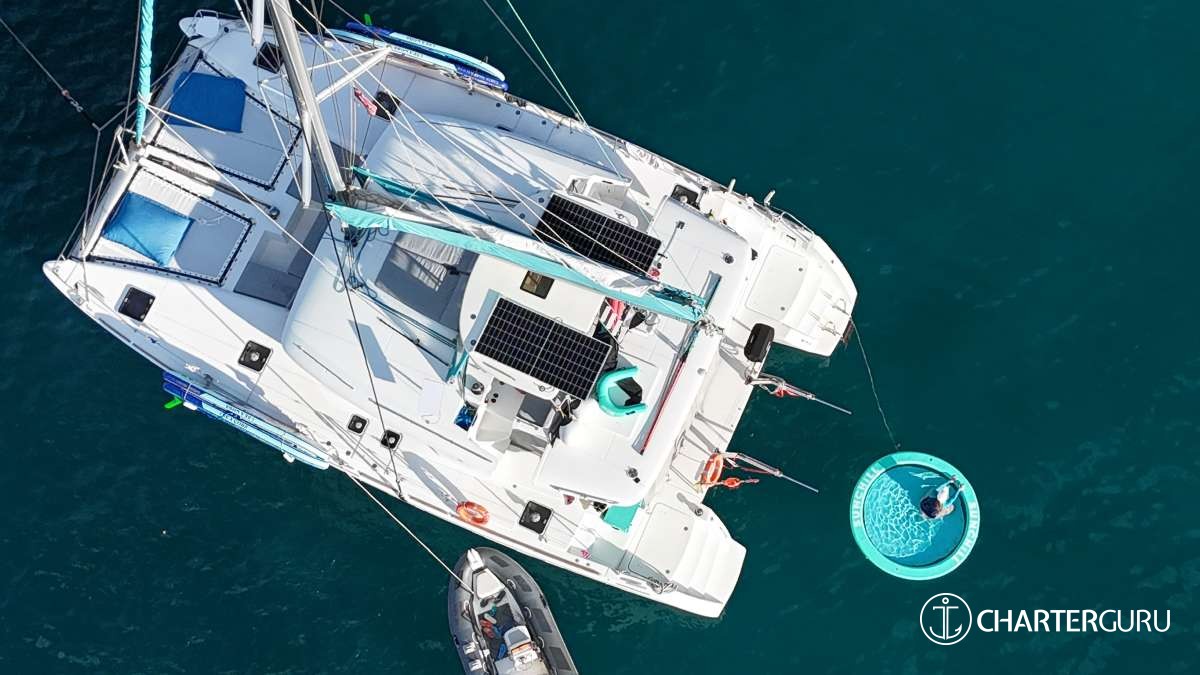 MAKIN’ MEMORIES is a 2016 Lagoon 450 (refit 2022) that delivers a surprising amount of space and a fresh, contemporary feel for Virgin Islands charters. Sleeps 8 in 4 Queen staterooms, each with individual climate control and a private ensuite. Light woods, clean lines, and plenty of natural light keep the interior bright and relaxed, while signature Lagoon wraparound windows bring panoramic views into the salon. The shaded cockpit offers two distinct seating zones with easy flow to the aft steps for quick swims. Up top, the flybridge is both the sailing action station and the best perch for dolphin spotting and island scenery. Forward, trampolines and lounge seating round out the open-air vibe. Spacious, breezy, and beautifully dialed in—MAKIN’ MEMORIES lives up to her name.