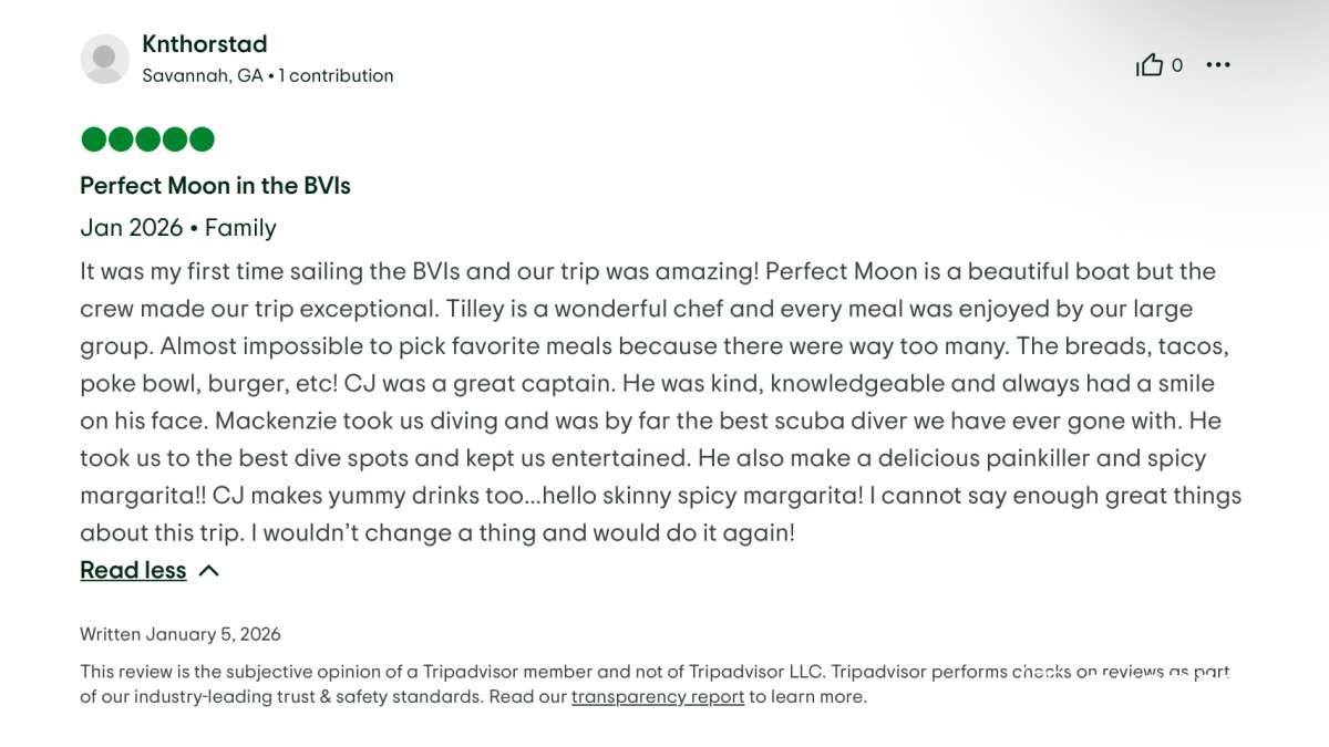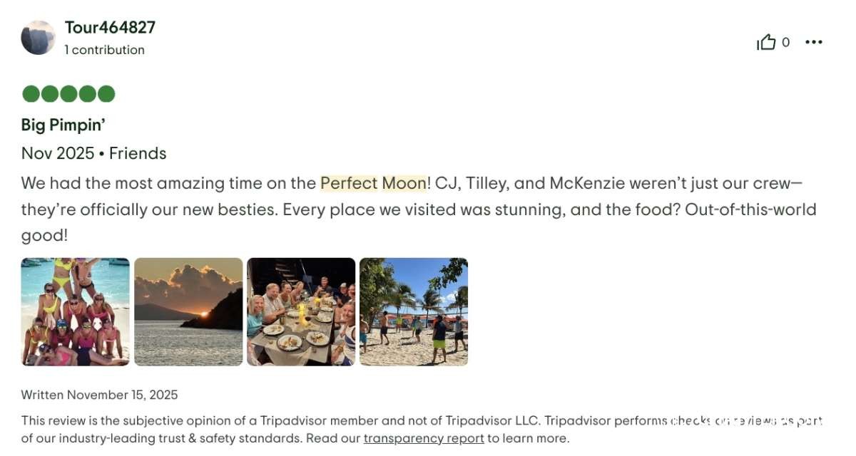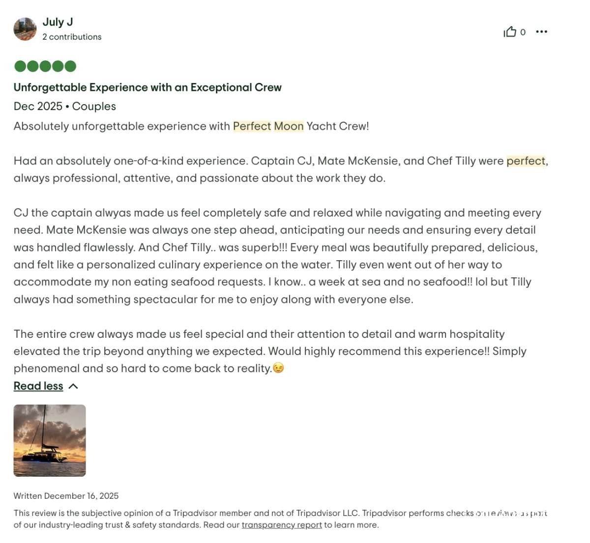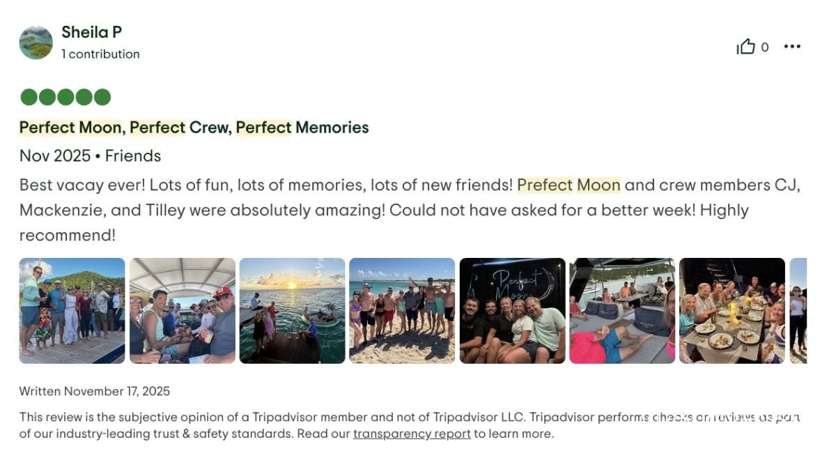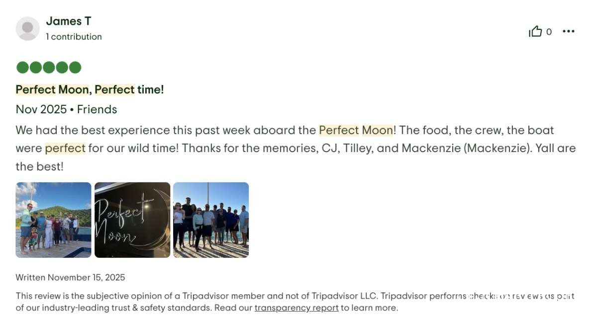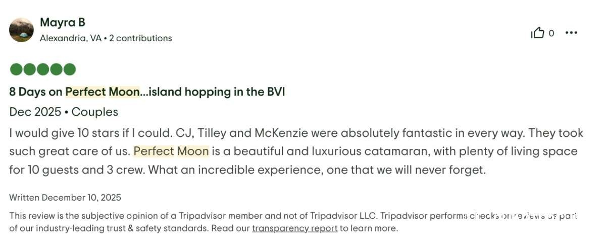 We had an amazing experience aboard the Perfect Moon catamaran. The crew, Capt. CJ, MacKenzie, and Tilley were the best. They made our trip absolutely memorable. They were professional, attentive, and knowledgeable about every aspect of BVI. They always had multiple options for fun at every island stop. The food onboard was so yummy thanks to Chef Tilley. I highly recommend the Perfect Moon, but most of all the crew.