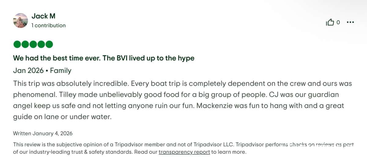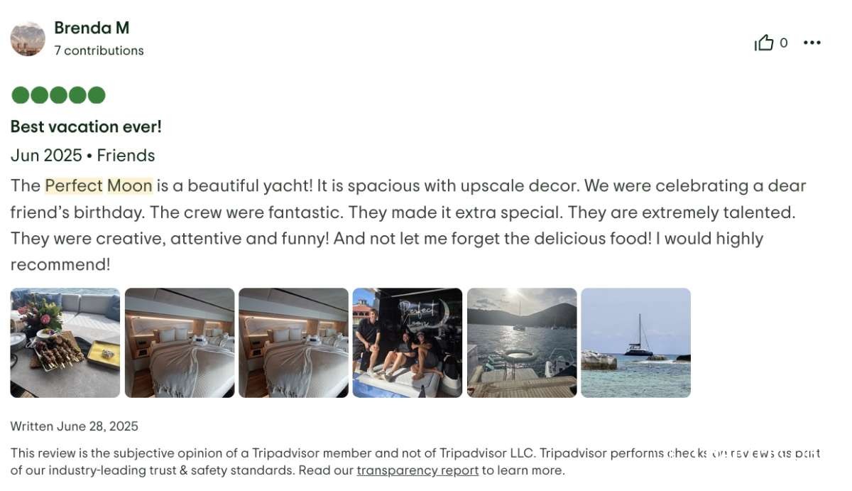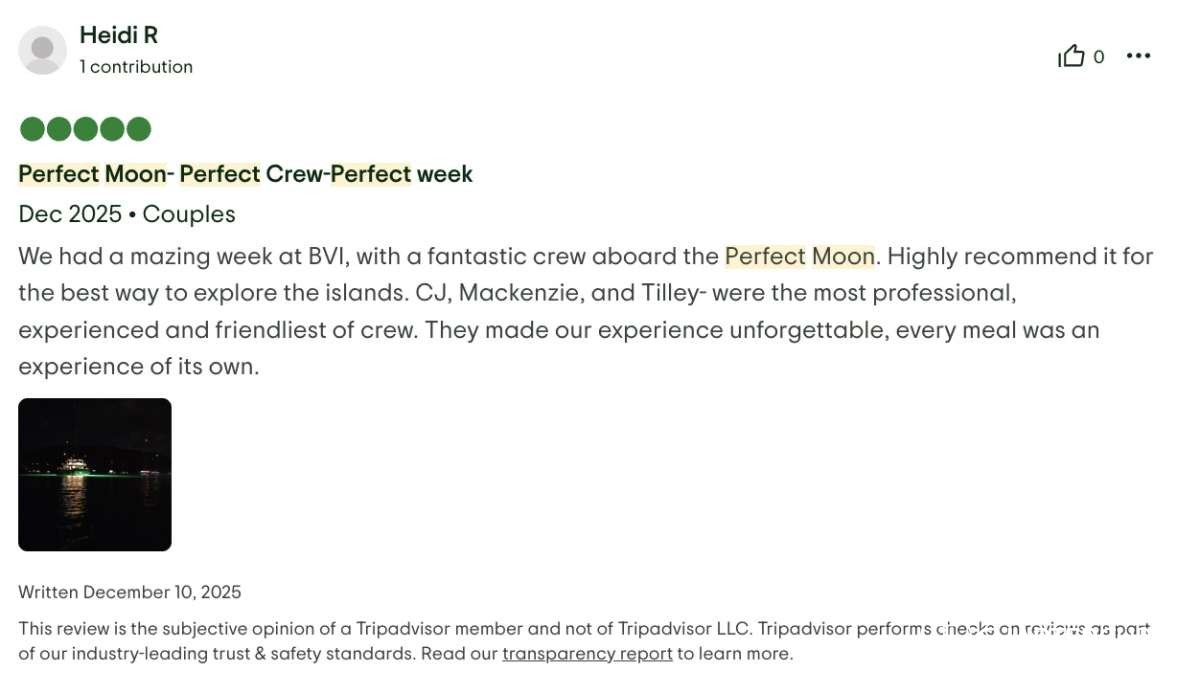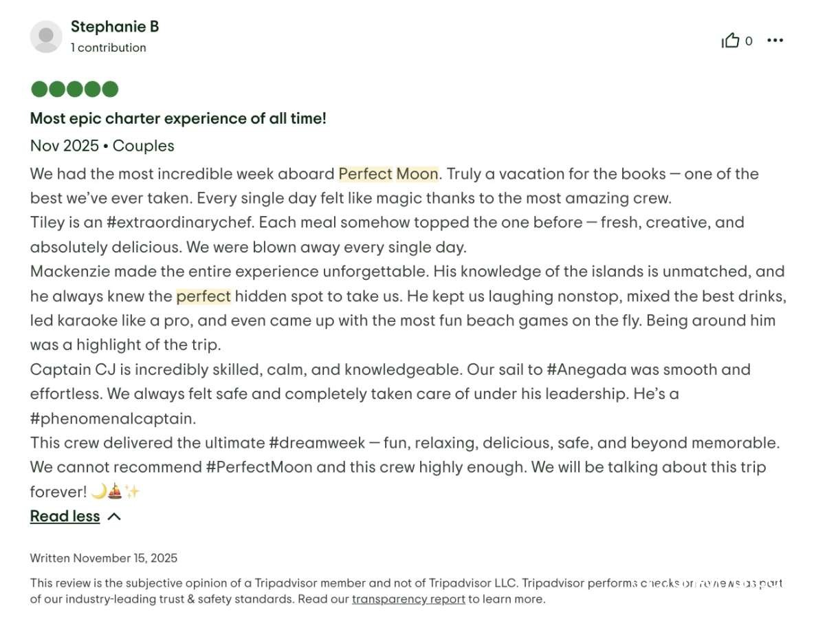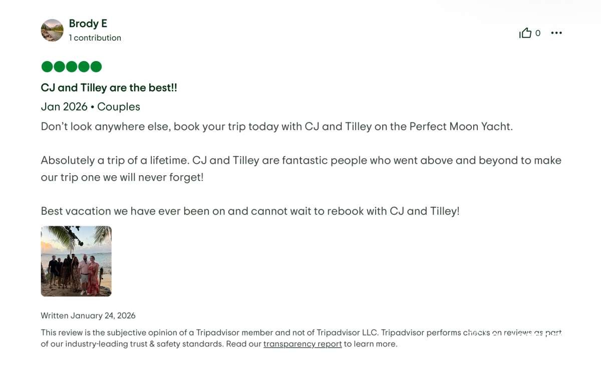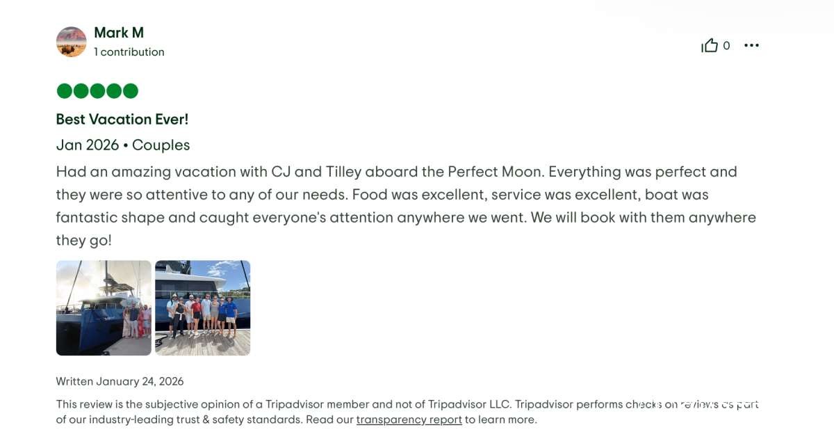 We had an amazing experience aboard the Perfect Moon catamaran. The crew, Capt. CJ, MacKenzie, and Tilley were the best. They made our trip absolutely memorable. They were professional, attentive, and knowledgeable about every aspect of BVI. They always had multiple options for fun at every island stop. The food onboard was so yummy thanks to Chef Tilley. I highly recommend the Perfect Moon, but most of all the crew.