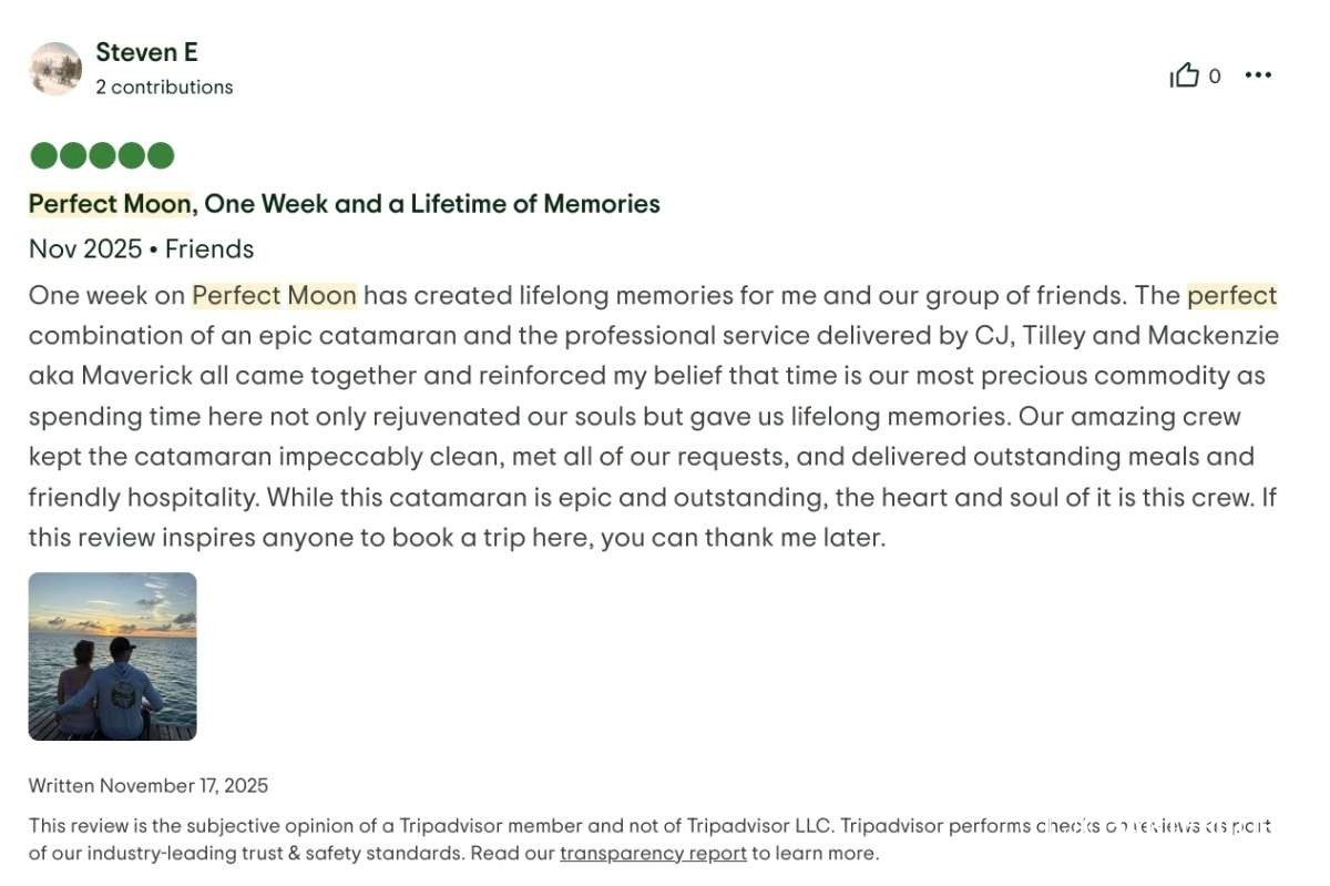 One week on Perfect Moon has created lifelong memories for me and our group of friends. The perfect combination of an epic catamaran and the professional service delivered by CJ, Tilley and Mackenzie aka Maverick all came together and reinforced my belief that time is our most precious commodity as spending time here not only rejuvenated our souls but gave us lifelong memories. Our amazing crew kept the catamaran impeccably clean, met all of our requests, and delivered outstanding meals and friendly hospitality. While this catamaran is epic and outstanding, the heart and soul of it is this crew. If this review inspires anyone to book a trip here, you can thank me later.