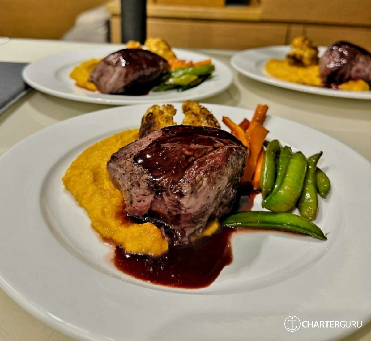 reflect the mood of the voyage—vibrant seafood lunches after a dive, refined wine-paired