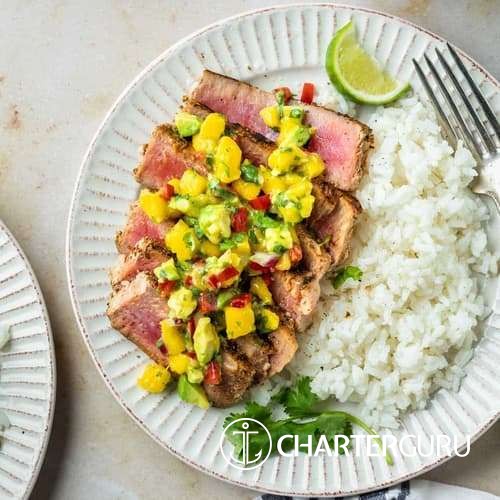 Tuna steak served with rice, accompanied by sweet mango, creamy avocado, pickled red onion, toasted pepitas, and a passion fruit citrus vinaigrette.