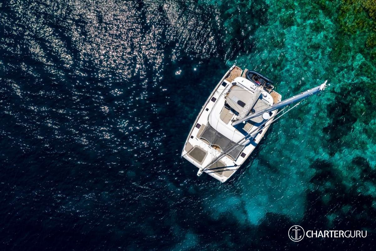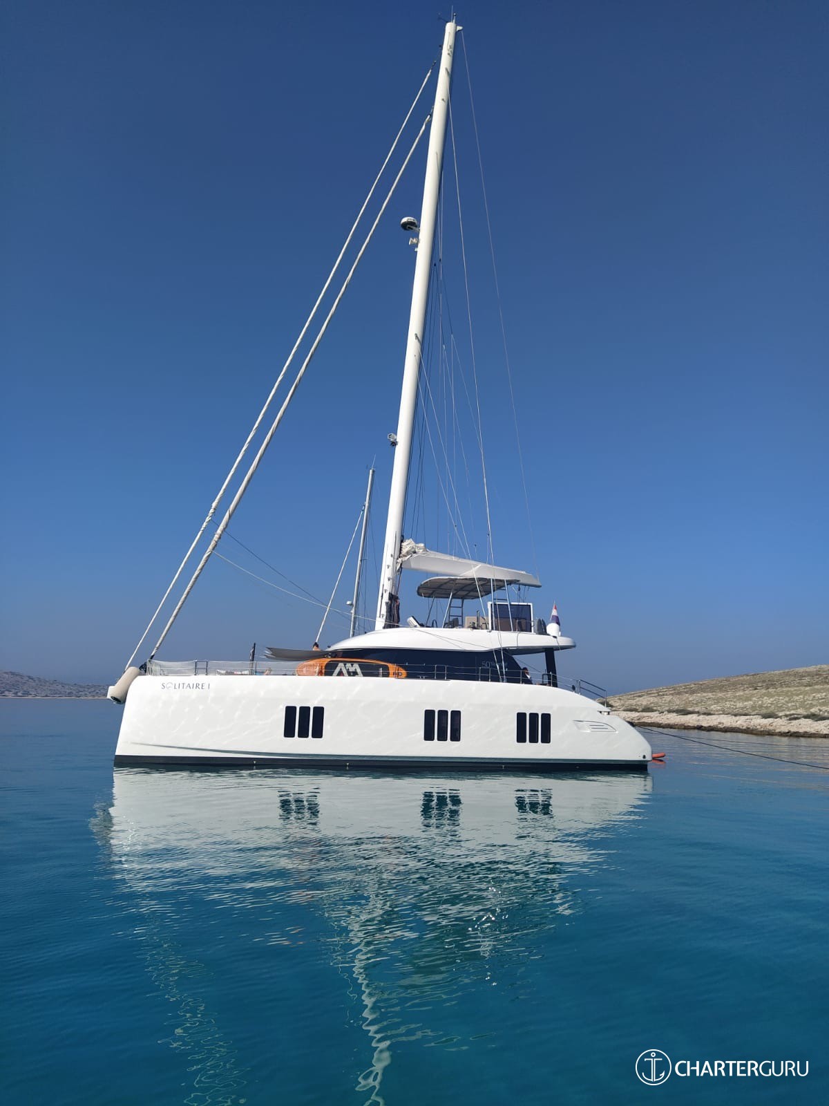 SOLITAIRE is introduced primarily as a sailing catamaran. The central space of the yacht is the main saloon, which connects to the aft deck. The aft deck is generous, with a prominent dining and seating area and that's where the guests spend most of their time. The fascinating cabins offer unbeatable views in the morning and are located just below deck. The cabins are connected by stairs to the main saloon - roomy, comfortable and pleasant. Multiple portholes offer desirable views, while providing privacy if needed.