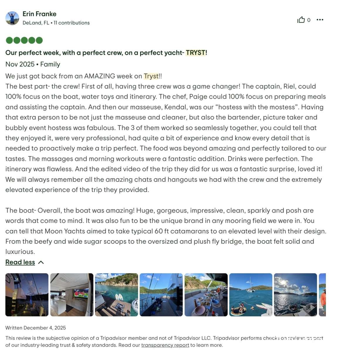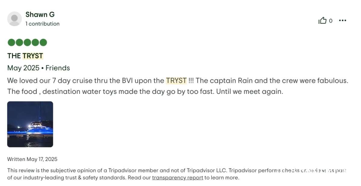 We were on a week long trip aboard the yacht “Tryst” through the BVI’s. Best vacation we’ve ever been on. The crew was absolutely wonderful!!! Accommodations, food, and conditions were perfect. I can’t say enough good things about this boat and crew. We WILL DEFINITELY BE BACK!