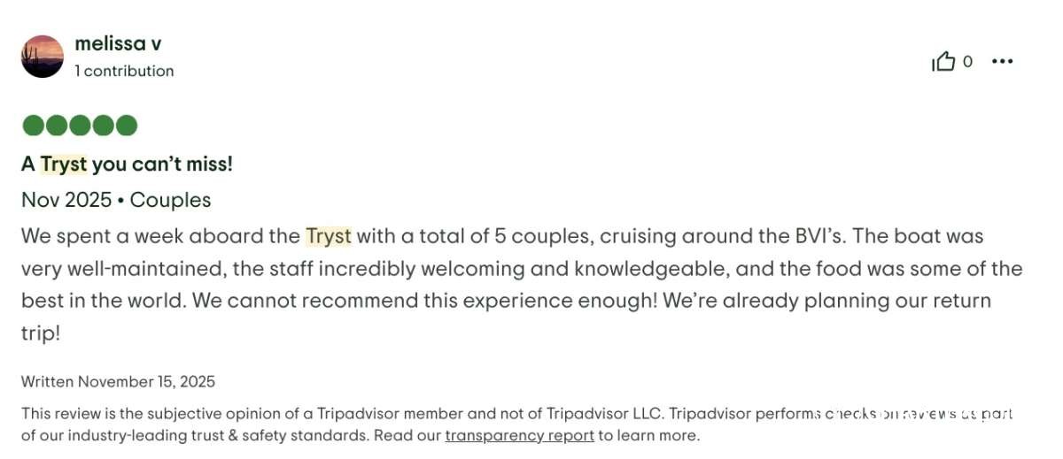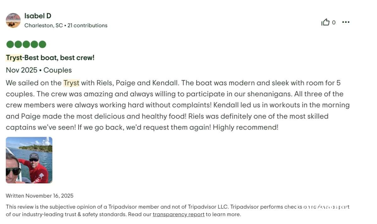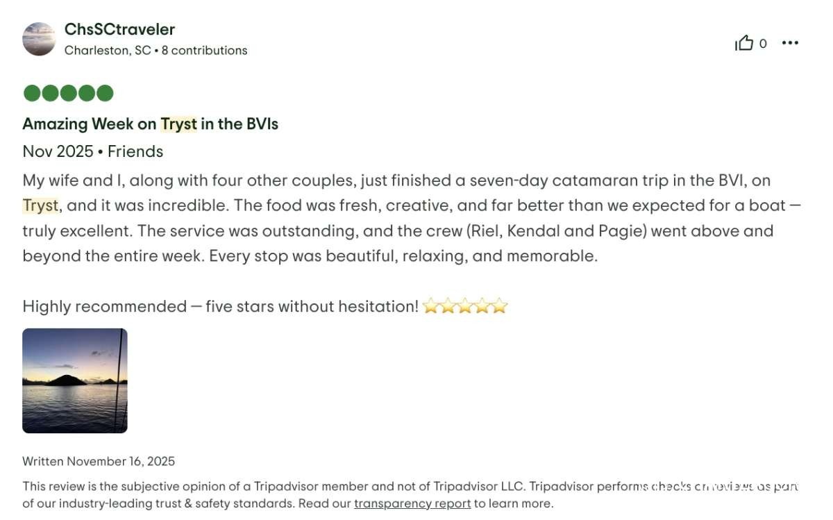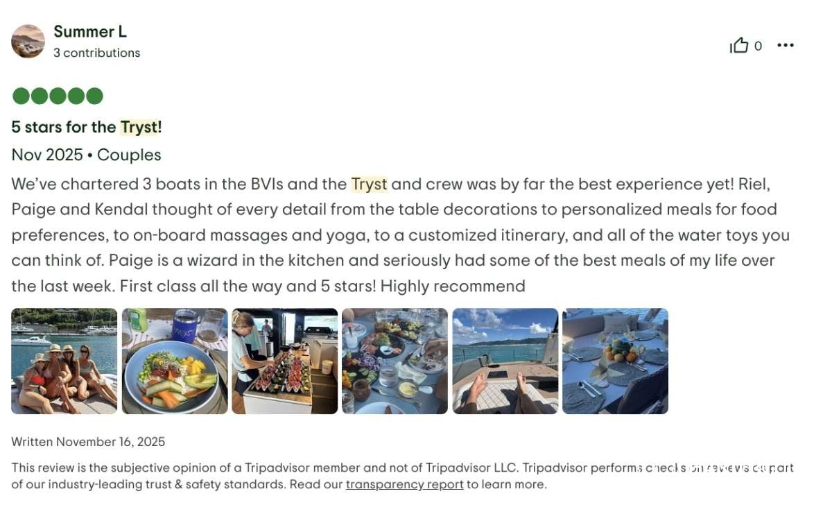 My wife and I, along with four other couples, just finished a seven-day catamaran trip in the BVI, on Tryst, and it was incredible. The food was fresh, creative, and far better than we expected for a boat — truly excellent. The service was outstanding, and the crew (Riel, Kendal and Pagie) went above and beyond the entire week. Every stop was beautiful, relaxing, and memorable.