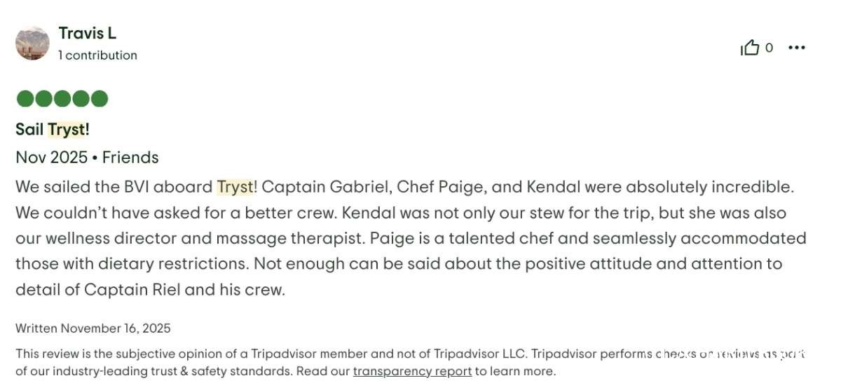 We sailed the BVI aboard Tryst! Captain Gabriel, Chef Paige, and Kendal were absolutely incredible. We couldn’t have asked for a better crew. Kendal was not only our stew for the trip, but she was also our wellness director and massage therapist. Paige is a talented chef and seamlessly accommodated those with dietary restrictions. Not enough can be said about the positive attitude and attention to detail of Captain Riel and his crew.