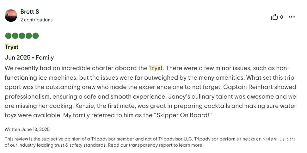 We recently had an incredible charter aboard the Tryst. There were a few minor issues, such as non-functioning ice machines, but the issues were far outweighed by the many amenities. What set this trip apart was the outstanding crew who made the experience one to not forget. Captain Reinhart showed professionalism, ensuring a safe and smooth experience. Janey’s culinary talent was awesome and we are missing her cooking. Kenzie, the first mate, was great in preparing cocktails and making sure water toys were available. My family referred to him as the “Skipper On Board!”