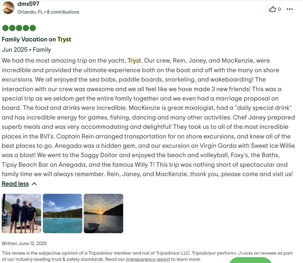 We had the most amazing trip on the yacht, Tryst. Our crew, Rein, Janey, and MacKenzie, were incredible and provided the ultimate experience both on the boat and off with the many on shore excursions. We all enjoyed the sea bobs, paddle boards, snorkeling, and wakeboarding! The interaction with our crew was awesome and we all feel like we have made 3 new friends! This was a special trip as we seldom get the entire family together and we even had a marriage proposal on board. The food and drinks were incredible. MacKenzie is great mixologist, had a "daily special drink" and has incredible energy for games, fishing, dancing and many other activities. Chef Janey prepared superb meals and was very accommodating and delightful! They took us to all of the most incredible places in the BVI's. Captain Rein arranged transportation for on shore excursions, and knew all of the best places to go. Anegada was a hidden gem, and our excursion on Virgin Gorda with Sweet Ice Willie was a blast! We went to the Soggy Dollar and enjoyed the beach and volleyball, Foxy's, the Baths, Tipsy Beach Bar on Anegada, and the famous Willy T! This trip was nothing short of spectacular and family time we will always remember. Rein, Janey, and MacKenzie, thank you, please come and visit us!